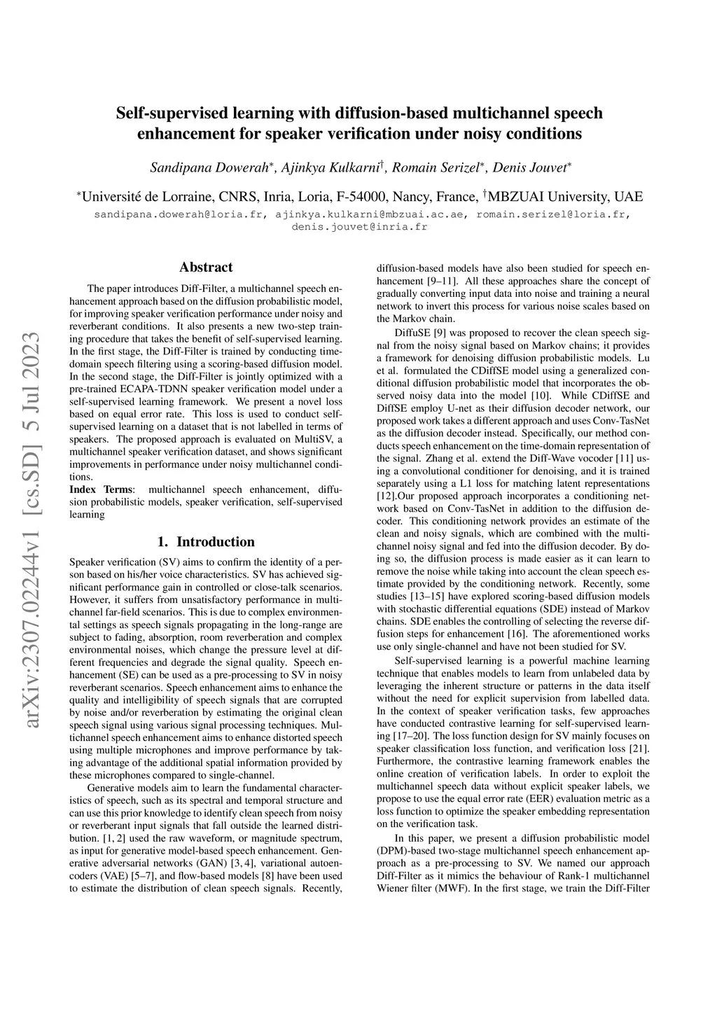 The paper introduces Diff-Filter, a multichannel speech enhancement approach based on the diffusion probabilistic model, for improving speaker verification performance under noisy and reverberant conditions. It also presents a new two-step training procedure that takes the benefit of self-supervised learning. In the first stage, the Diff-Filter is trained by conducting timedomain speech filtering using a scoring-based diffusion model. In the second stage, the Diff-Filter is jointly optimized with a pre-trained ECAPA-TDNN speaker verification model under a self-supervised learning framework. We present a novel loss based on equal error rate. This loss is used to conduct selfsupervised learning on a dataset that is not labelled in terms of speakers. The proposed approach is evaluated on MultiSV, a multichannel speaker verification dataset, and shows significant improvements in performance under noisy multichannel conditions.