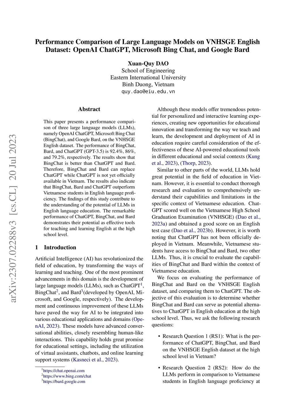 This paper presents a performance comparison of three large language models (LLMs), namely OpenAI ChatGPT, Microsoft Bing Chat (BingChat), and Google Bard, on the VNHSGE English dataset. The performance of BingChat, Bard, and ChatGPT (GPT-3.5) is 92.4\%, 86\%, and 79.2\%, respectively. The results show that BingChat is better than ChatGPT and Bard. Therefore, BingChat and Bard can replace ChatGPT while ChatGPT is not yet officially available in Vietnam. The results also indicate that BingChat, Bard and ChatGPT outperform Vietnamese students in English language proficiency. The findings of this study contribute to the understanding of the potential of LLMs in English language education. The remarkable performance of ChatGPT, BingChat, and Bard demonstrates their potential as effective tools for teaching and learning English at the high school level.