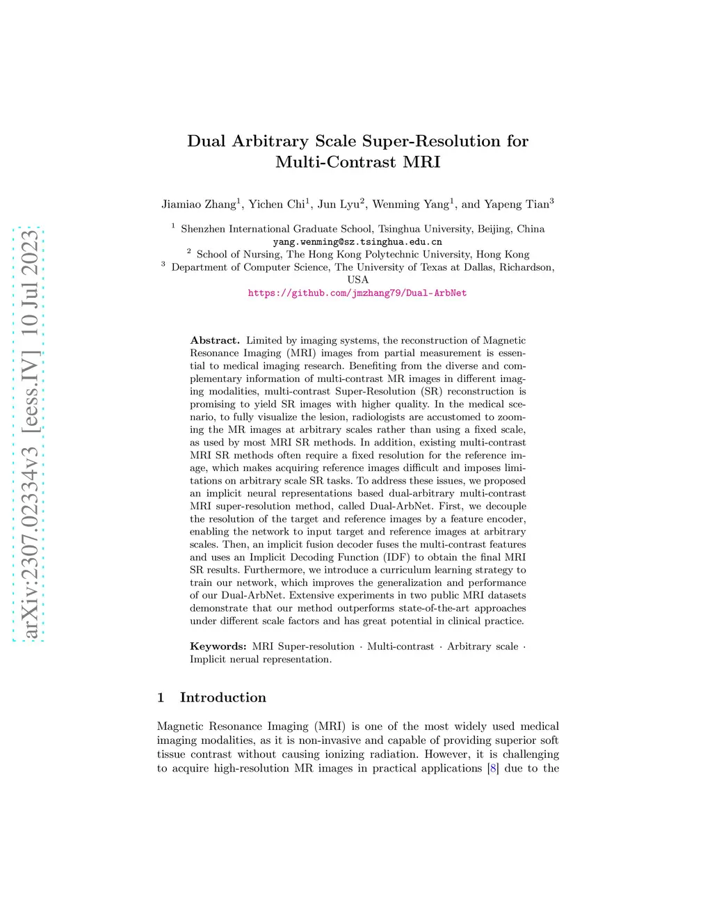Dual Arbitrary Scale Super-Resolution for Multi-Contrast MRI