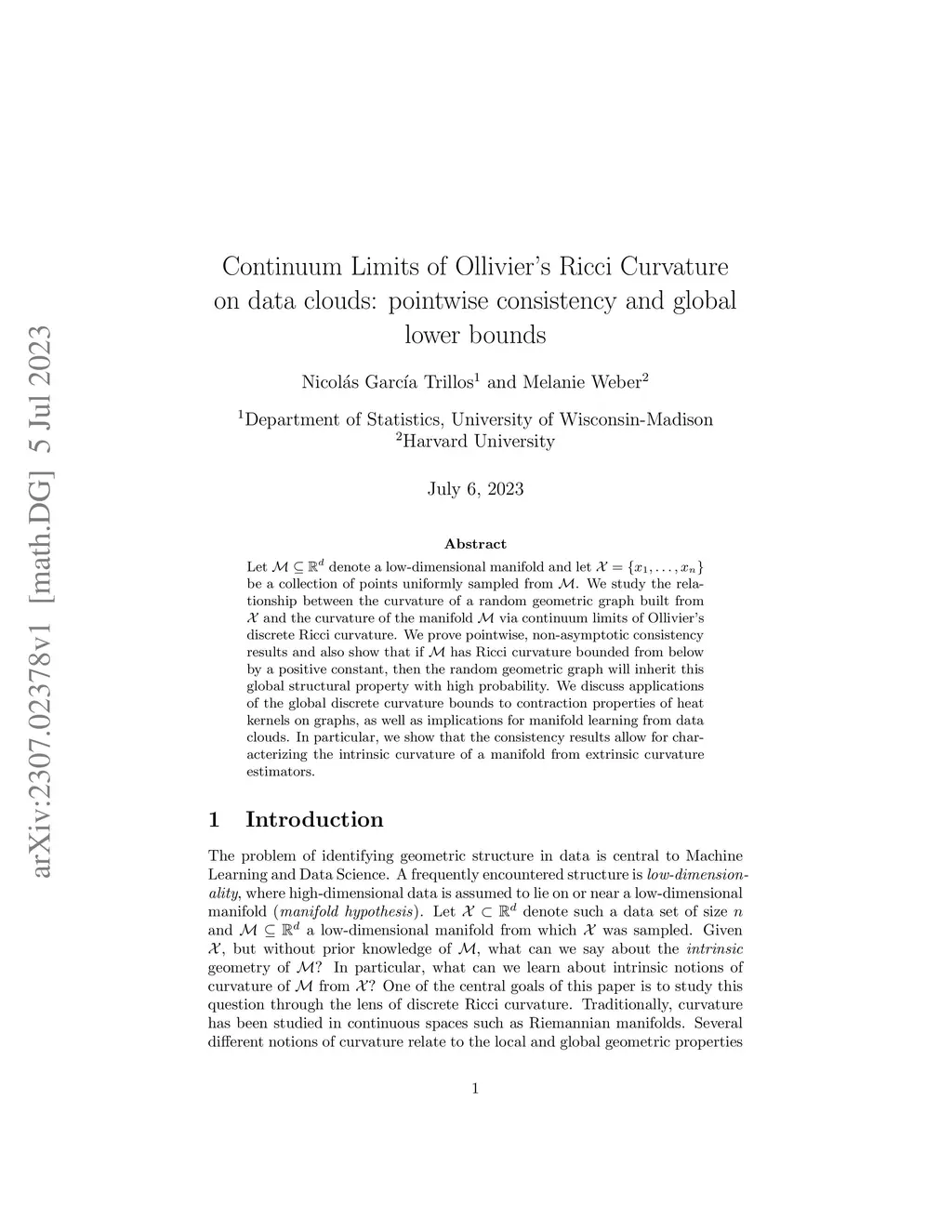 Let denote a low-dimensional manifold and let be a collection of points uniformly sampled from . We study the relationship between the curvature of a random geometric graph built from and the curvature of the manifold via continuum limits of Ollivier's discrete Ricci curvature. We prove pointwise, non-asymptotic consistency results and also show that if has Ricci curvature bounded from below by a positive constant, then the random geometric graph will inherit this global structural property with high probability. We discuss applications of the global discrete curvature bounds to contraction properties of heat kernels on graphs, as well as implications for manifold learning from data clouds. In particular, we show that the consistency results allow for characterizing the intrinsic curvature of a manifold from extrinsic curvature.