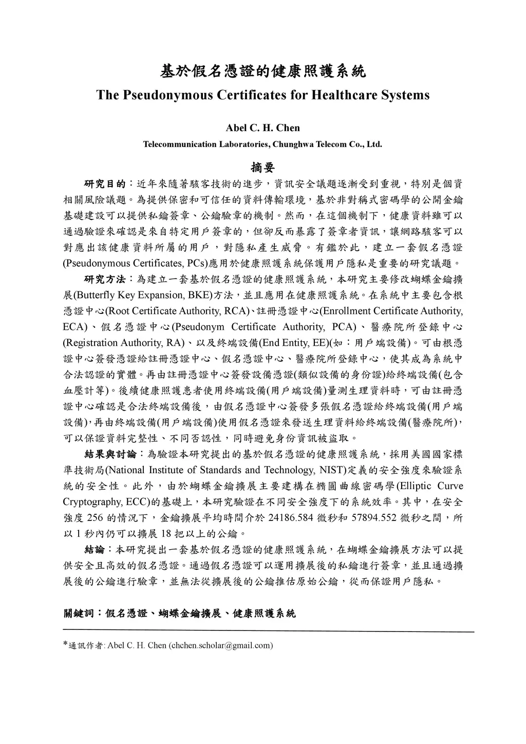 This study mainly modifies the butterfly key expansion (BKE) mechanism and applies it to the healthcare system. The system mainly includes a Root Certificate Authority (RCA), an Enrollment Certificate Authority (ECA), a Pseudonym Certificate Authority (PCA), a Registration Authority (RA), and End Entities (EEs)(i.e. user devices). Certificates can be issued by the RCA to the ECA, PCA, and RA to make them legal entities in the system. The ECA then issues device certificates (similar to identification cards for devices) to the EEs (e.g. blood pressure monitors). When patients use EEs to measure physiological information, the RA verifies that the EE is legal based on the issued multiple pseudonym certificates by the PCA. The EE then uses the pseudonym certificates to send physiological information to the RA, ensuring data integrity and non-repudiation, while also preventing identity information from being stolen. To verify the pseudonymous certificate-based healthcare system proposed in this study, the security of the system was verified using the security strengths defined by the National Institute of Standards and Technology (NIST) in the United States. Furthermore, as the BKE mechanism is primarily based on Elliptic Curve Cryptography (ECC), this study also verified the efficiency under different security strengths. Furthermore, under 256 of security strength, the mean computation time of key expansion is between 24186.584 microseconds and 57894.552 microseconds, so more than 18 public keys could be generated in one second.