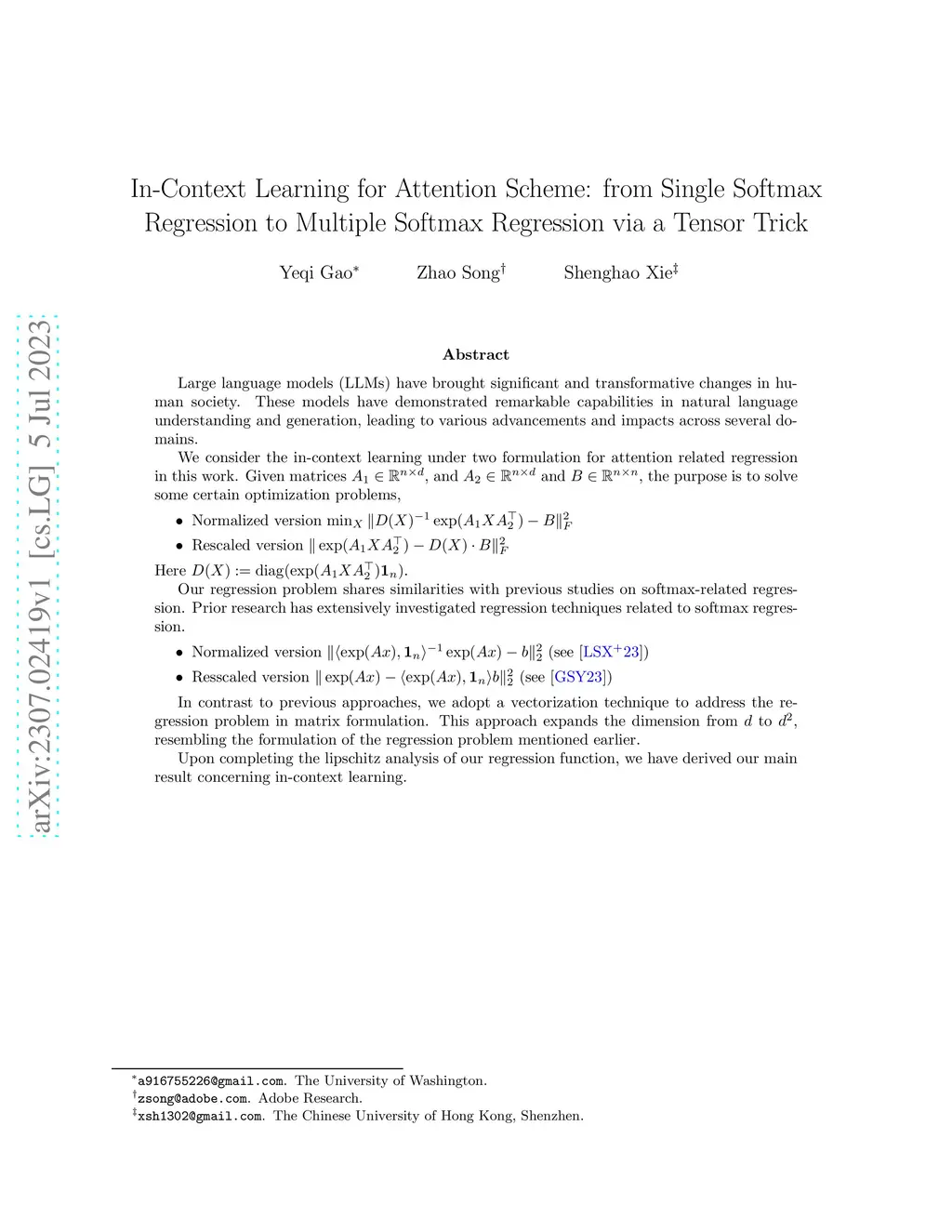 Large language models (LLMs) have brought significant and transformative changes in human society. These models have demonstrated remarkable capabilities in natural language understanding and generation, leading to various advancements and impacts across several domains. We consider the in-context learning under two formulation for attention related regression in this work. Given matrices , and and , the purpose is to solve some certain optimization problems: Normalized version and Rescaled version . Here . Our regression problem shares similarities with previous studies on softmax-related regression. Prior research has extensively investigated regression techniques related to softmax regression: Normalized version and Resscaled version $\| \exp(Ax) - \langle \exp(Ax), {\bf 1}_n \rangle b \|_2^2 $ In contrast to previous approaches, we adopt a vectorization technique to address the regression problem in matrix formulation. This approach expands the dimension from to , resembling the formulation of the regression problem mentioned earlier. Upon completing the lipschitz analysis of our regression function, we have derived our main result concerning in-context learning.