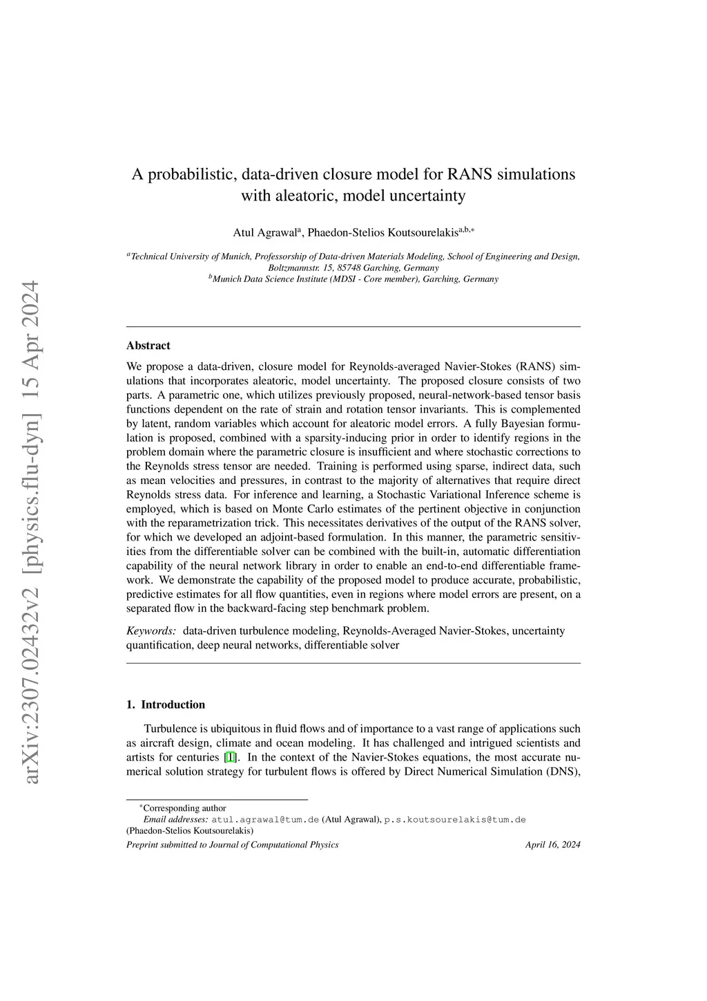 We propose a data-driven, closure model for Reynolds-averaged Navier-Stokes (RANS) simulations that incorporates aleatoric, model uncertainty. The proposed closure consists of two parts. A parametric one, which utilizes previously proposed, neural-network-based tensor basis functions dependent on the rate of strain and rotation tensor invariants. This is complemented by latent, random variables which account for aleatoric model errors. A fully Bayesian formulation is proposed, combined with a sparsity-inducing prior in order to identify regions in the problem domain where the parametric closure is insufficient and where stochastic corrections to the Reynolds stress tensor are needed. Training is performed using sparse, indirect data, such as mean velocities and pressures, in contrast to the majority of alternatives that require direct Reynolds stress data. For inference and learning, a Stochastic Variational Inference scheme is employed, which is based on Monte Carlo estimates of the pertinent objective in conjunction with the reparametrization trick. This necessitates derivatives of the output of the RANS solver, for which we developed an adjoint-based formulation. In this manner, the parametric sensitivities from the differentiable solver can be combined with the built-in, automatic differentiation capability of the neural network library in order to enable an end-to-end differentiable framework. We demonstrate the capability of the proposed model to produce accurate, probabilistic, predictive estimates for all flow quantities, even in regions where model errors are present, on a separated flow in the backward-facing step benchmark problem.