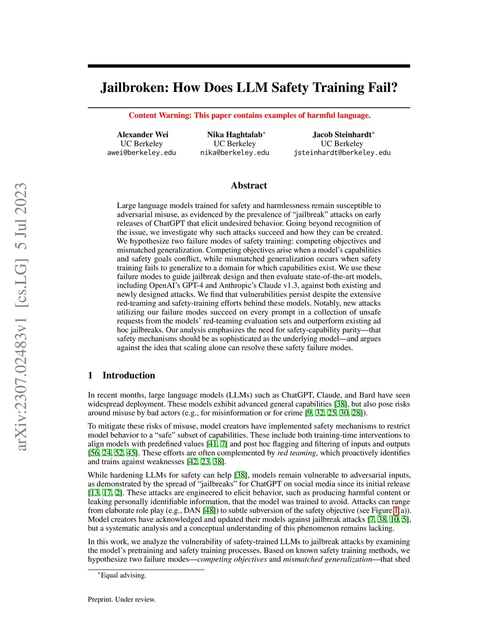Large language models trained for safety and harmlessness remain susceptible to adversarial misuse, as evidenced by the prevalence of "jailbreak" attacks on early releases of ChatGPT that elicit undesired behavior. Going beyond recognition of the issue, we investigate why such attacks succeed and how they can be created. We hypothesize two failure modes of safety training: competing objectives and mismatched generalization. Competing objectives arise when a model's capabilities and safety goals conflict, while mismatched generalization occurs when safety training fails to generalize to a domain for which capabilities exist. We use these failure modes to guide jailbreak design and then evaluate state-of-the-art models, including OpenAI's GPT-4 and Anthropic's Claude v1.3, against both existing and newly designed attacks. We find that vulnerabilities persist despite the extensive red-teaming and safety-training efforts behind these models. Notably, new attacks utilizing our failure modes succeed on every prompt in a collection of unsafe requests from the models' red-teaming evaluation sets and outperform existing ad hoc jailbreaks. Our analysis emphasizes the need for safety-capability parity -- that safety mechanisms should be as sophisticated as the underlying model -- and argues against the idea that scaling alone can resolve these safety failure modes.