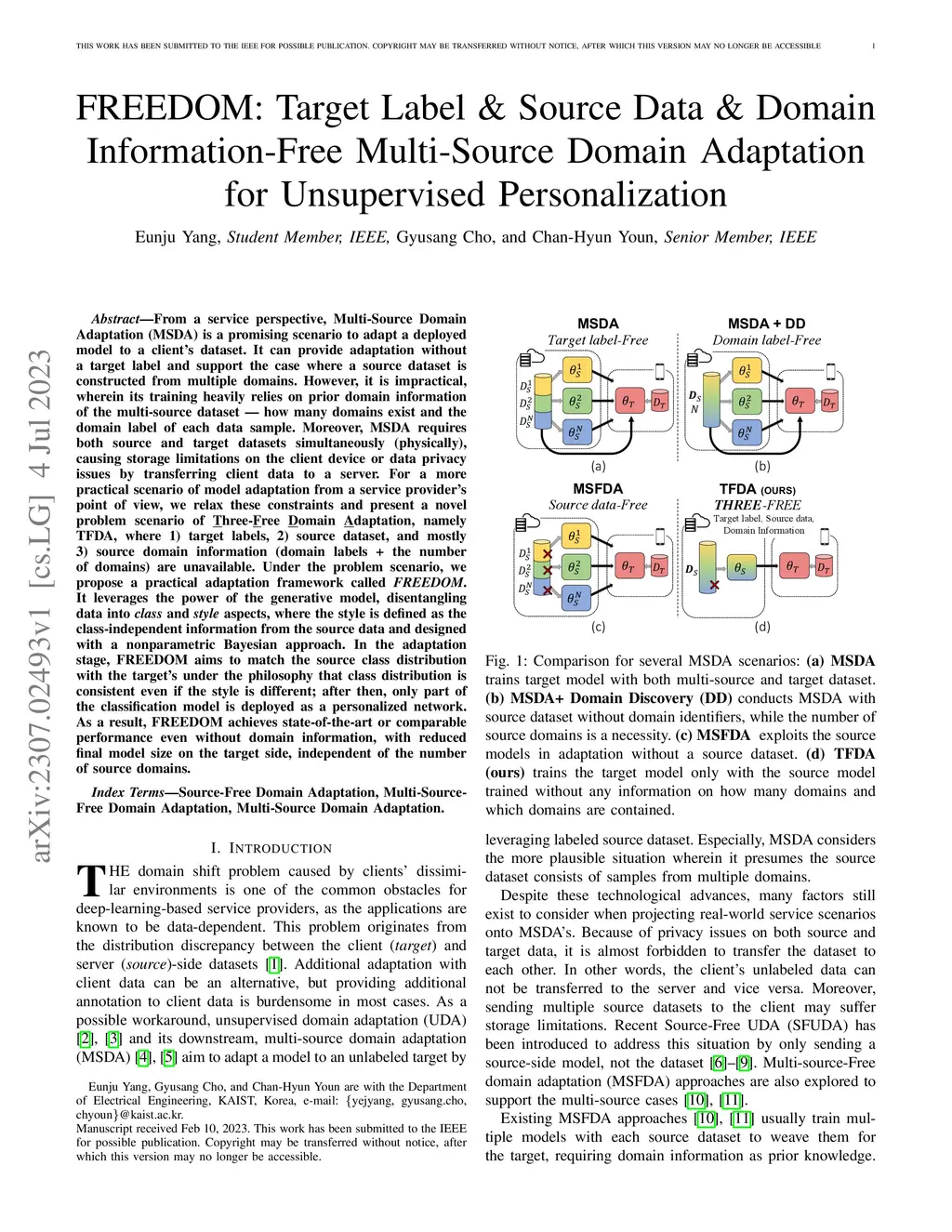 From a service perspective, Multi-Source Domain Adaptation (MSDA) is a promising scenario to adapt a deployed model to a client's dataset. It can provide adaptation without a target label and support the case where a source dataset is constructed from multiple domains. However, it is impractical, wherein its training heavily relies on prior domain information of the multi-source dataset -- how many domains exist and the domain label of each data sample. Moreover, MSDA requires both source and target datasets simultaneously (physically), causing storage limitations on the client device or data privacy issues by transferring client data to a server. For a more practical scenario of model adaptation from a service provider's point of view, we relax these constraints and present a novel problem scenario of Three-Free Domain Adaptation, namely TFDA, where 1) target labels, 2) source dataset, and mostly 3) source domain information (domain labels + the number of domains) are unavailable. Under the problem scenario, we propose a practical adaptation framework called FREEDOM. It leverages the power of the generative model, disentangling data into class and style aspects, where the style is defined as the class-independent information from the source data and designed with a nonparametric Bayesian approach. In the adaptation stage, FREEDOM aims to match the source class distribution with the target's under the philosophy that class distribution is consistent even if the style is different; after then, only part of the classification model is deployed as a personalized network. As a result, FREEDOM achieves state-of-the-art or comparable performance even without domain information, with reduced final model size on the target side, independent of the number of source domains.