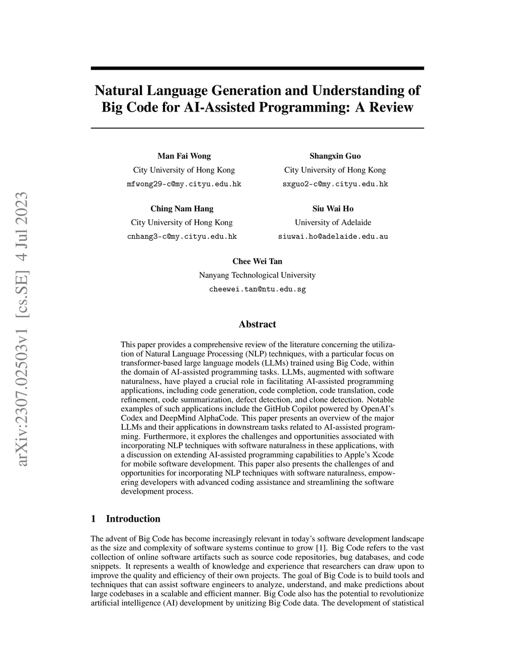 This paper provides a comprehensive review of the literature concerning the utilization of Natural Language Processing (NLP) techniques, with a particular focus on transformer-based large language models (LLMs) trained using Big Code, within the domain of AI-assisted programming tasks. LLMs, augmented with software naturalness, have played a crucial role in facilitating AI-assisted programming applications, including code generation, code completion, code translation, code refinement, code summarization, defect detection, and clone detection. Notable examples of such applications include the GitHub Copilot powered by OpenAI's Codex and DeepMind AlphaCode. This paper presents an overview of the major LLMs and their applications in downstream tasks related to AI-assisted programming. Furthermore, it explores the challenges and opportunities associated with incorporating NLP techniques with software naturalness in these applications, with a discussion on extending AI-assisted programming capabilities to Apple's Xcode for mobile software development. This paper also presents the challenges of and opportunities for incorporating NLP techniques with software naturalness, empowering developers with advanced coding assistance and streamlining the software development process.