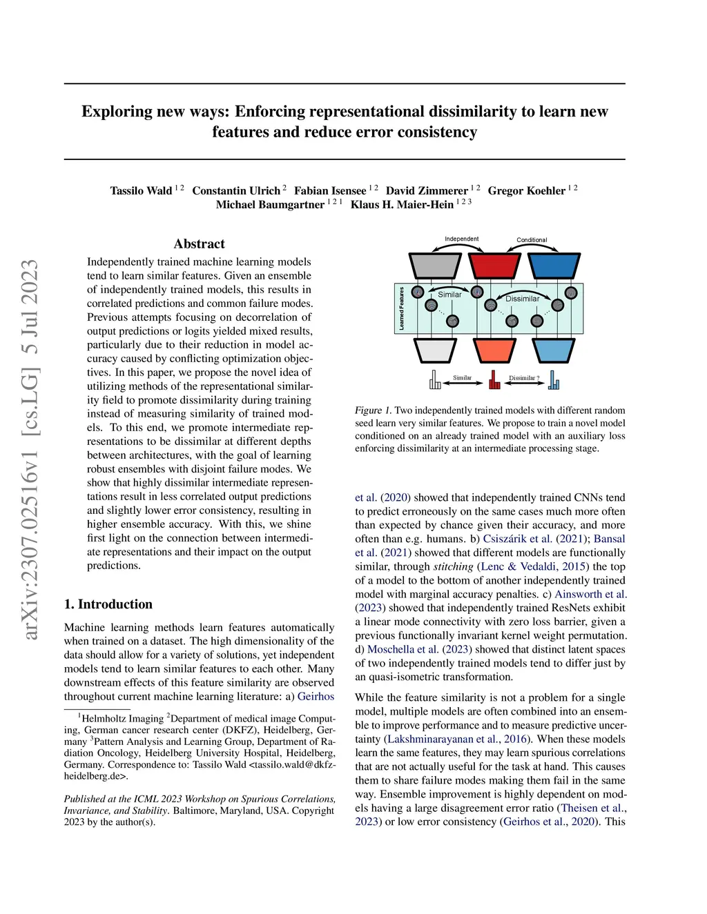 Independently trained machine learning models tend to learn similar features. Given an ensemble of independently trained models, this results in correlated predictions and common failure modes. Previous attempts focusing on decorrelation of output predictions or logits yielded mixed results, particularly due to their reduction in model accuracy caused by conflicting optimization objectives. In this paper, we propose the novel idea of utilizing methods of the representational similarity field to promote dissimilarity during training instead of measuring similarity of trained models. To this end, we promote intermediate representations to be dissimilar at different depths between architectures, with the goal of learning robust ensembles with disjoint failure modes. We show that highly dissimilar intermediate representations result in less correlated output predictions and slightly lower error consistency, resulting in higher ensemble accuracy. With this, we shine first light on the connection between intermediate representations and their impact on the output predictions.