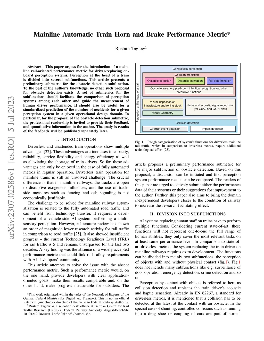 This paper argues for the introduction of a mainline rail-oriented performance metric for driver-replacing on-board perception systems. Perception at the head of a train is divided into several subfunctions. This article presents a preliminary submetric for the obstacle detection subfunction. To the best of the author's knowledge, no other such proposal for obstacle detection exists. A set of submetrics for the subfunctions should facilitate the comparison of perception systems among each other and guide the measurement of human driver performance. It should also be useful for a standardized prediction of the number of accidents for a given perception system in a given operational design domain. In particular, for the proposal of the obstacle detection submetric, the professional readership is invited to provide their feedback and quantitative information to the author. The analysis results of the feedback will be published separately later.