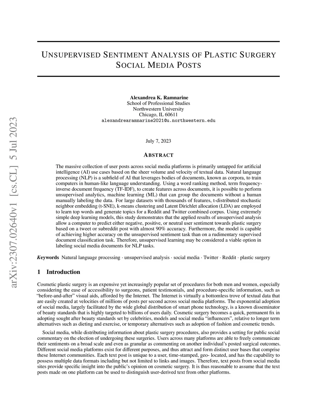 Unsupervised Sentiment Analysis of Plastic Surgery Social Media Posts