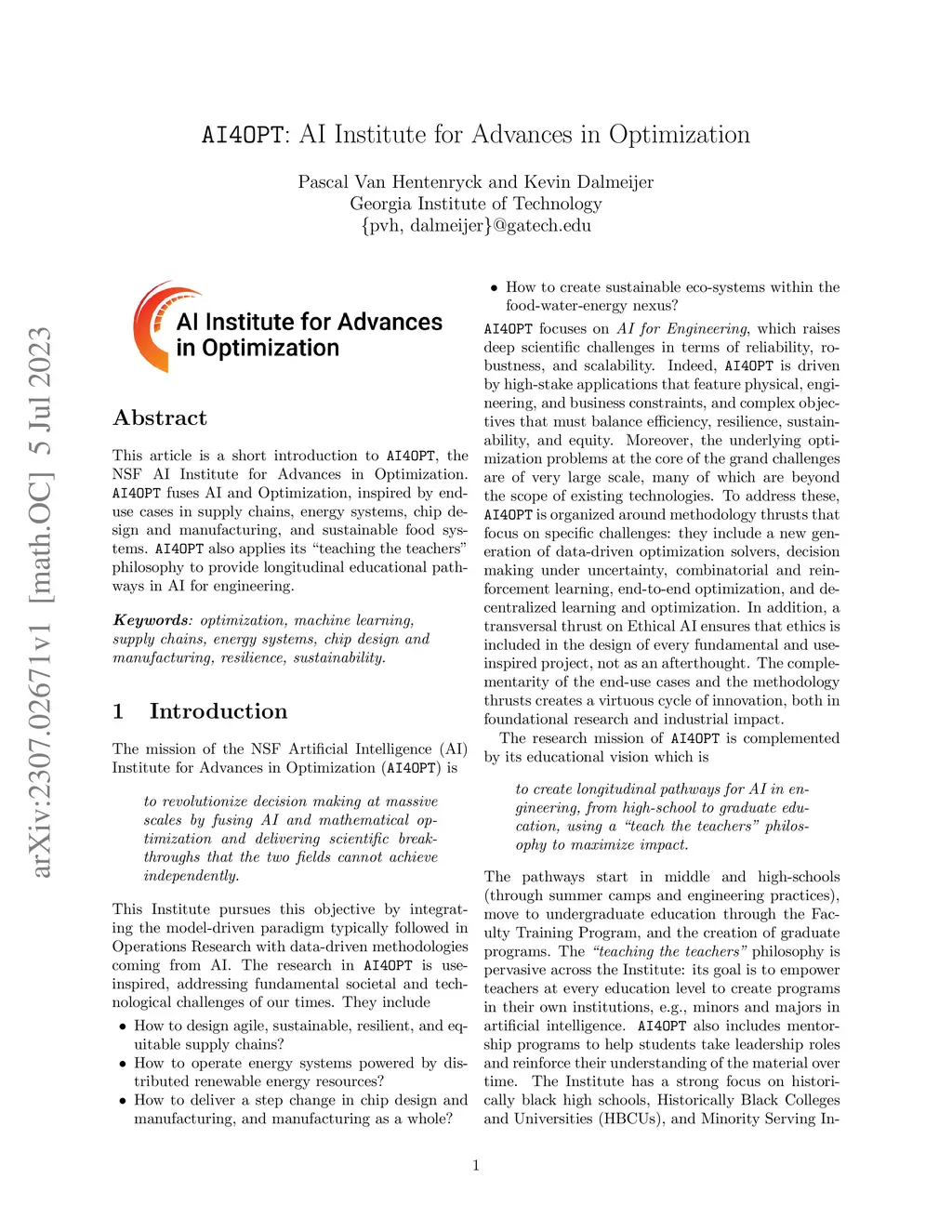 This article is a short introduction to AI4OPT, the NSF AI Institute for Advances in Optimization. AI4OPT fuses AI and Optimization, inspired by end-use cases in supply chains, energy systems, chip design and manufacturing, and sustainable food systems. AI4OPT also applies its "teaching the teachers" philosophy to provide longitudinal educational pathways in AI for engineering.