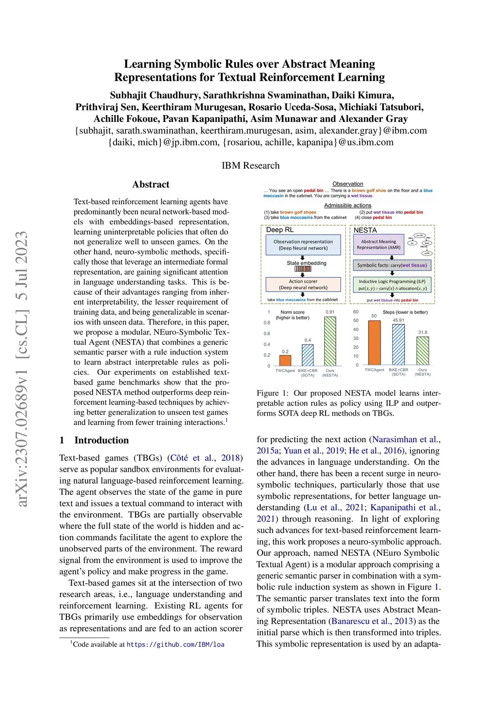 Text-based reinforcement learning agents have predominantly been neural network-based models with embeddings-based representation, learning uninterpretable policies that often do not generalize well to unseen games. On the other hand, neuro-symbolic methods, specifically those that leverage an intermediate formal representation, are gaining significant attention in language understanding tasks. This is because of their advantages ranging from inherent interpretability, the lesser requirement of training data, and being generalizable in scenarios with unseen data. Therefore, in this paper, we propose a modular, NEuro-Symbolic Textual Agent (NESTA) that combines a generic semantic parser with a rule induction system to learn abstract interpretable rules as policies. Our experiments on established text-based game benchmarks show that the proposed NESTA method outperforms deep reinforcement learning-based techniques by achieving better generalization to unseen test games and learning from fewer training interactions.
