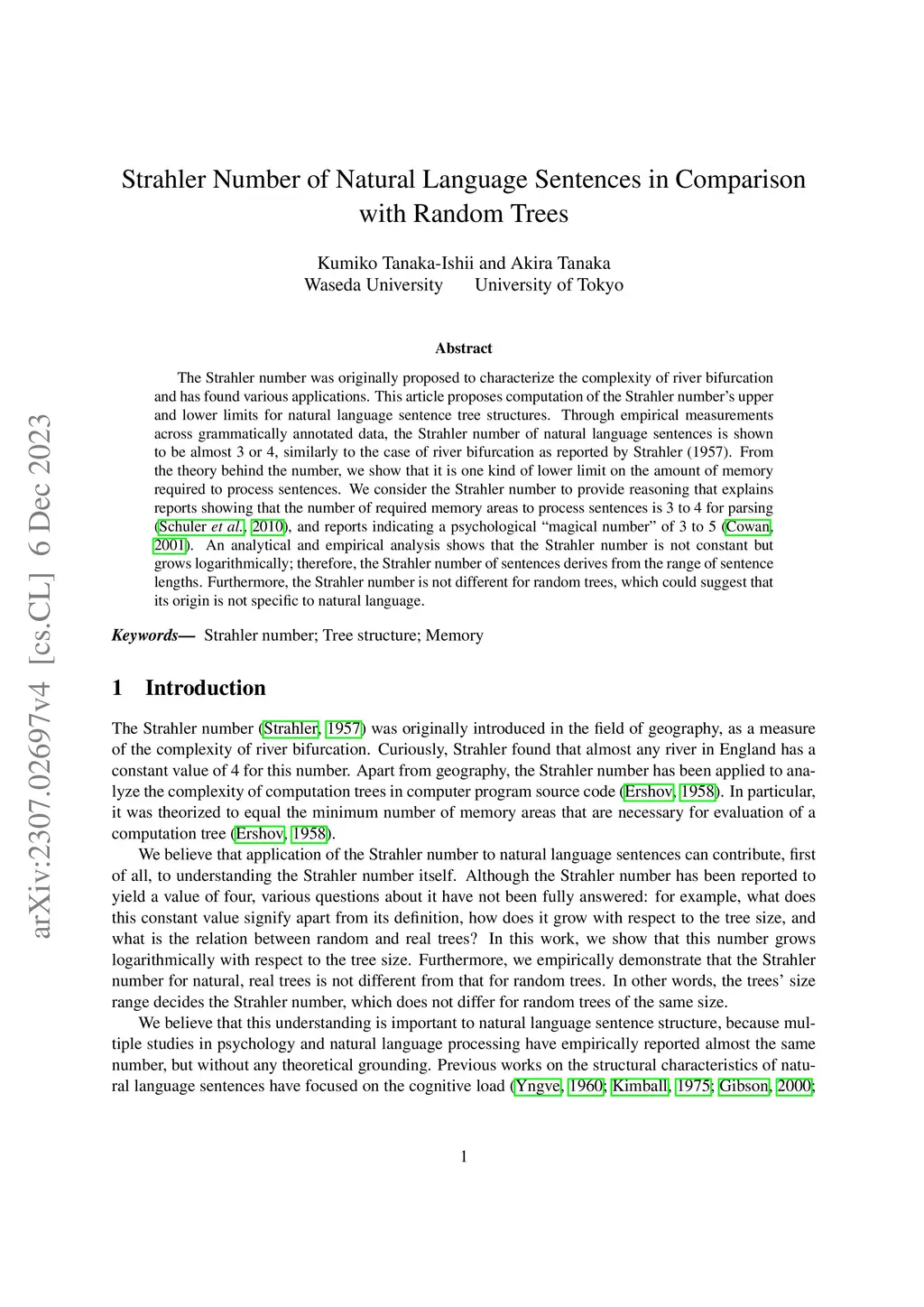 The Strahler number was originally proposed to characterize the complexity of river bifurcation and has found various applications. This article proposes computation of the Strahler number's upper and lower limits for natural language sentence tree structures. Through empirical measurements across grammatically annotated data, the Strahler number of natural language sentences is shown to be almost 3 or 4, similarly to the case of river bifurcation as reported by Strahler (1957). From the theory behind the number, we show that it is one kind of lower limit on the amount of memory required to process sentences. We consider the Strahler number to provide reasoning that explains reports showing that the number of required memory areas to process sentences is 3 to 4 for parsing (Schuler et al., 2010), and reports indicating a psychological "magical number" of 3 to 5 (Cowan, 2001). An analytical and empirical analysis shows that the Strahler number is not constant but grows logarithmically; therefore, the Strahler number of sentences derives from the range of sentence lengths. Furthermore, the Strahler number is not different for random trees, which could suggest that its origin is not specific to natural language.