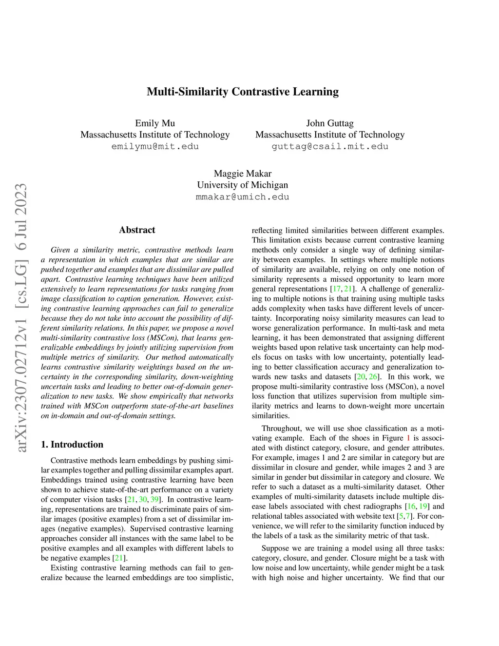 Given a similarity metric, contrastive methods learn a representation in which examples that are similar are pushed together and examples that are dissimilar are pulled apart. Contrastive learning techniques have been utilized extensively to learn representations for tasks ranging from image classification to caption generation. However, existing contrastive learning approaches can fail to generalize because they do not take into account the possibility of different similarity relations. In this paper, we propose a novel multi-similarity contrastive loss (MSCon), that learns generalizable embeddings by jointly utilizing supervision from multiple metrics of similarity. Our method automatically learns contrastive similarity weightings based on the uncertainty in the corresponding similarity, down-weighting uncertain tasks and leading to better out-of-domain generalization to new tasks. We show empirically that networks trained with MSCon outperform state-of-the-art baselines on in-domain and out-of-domain settings.