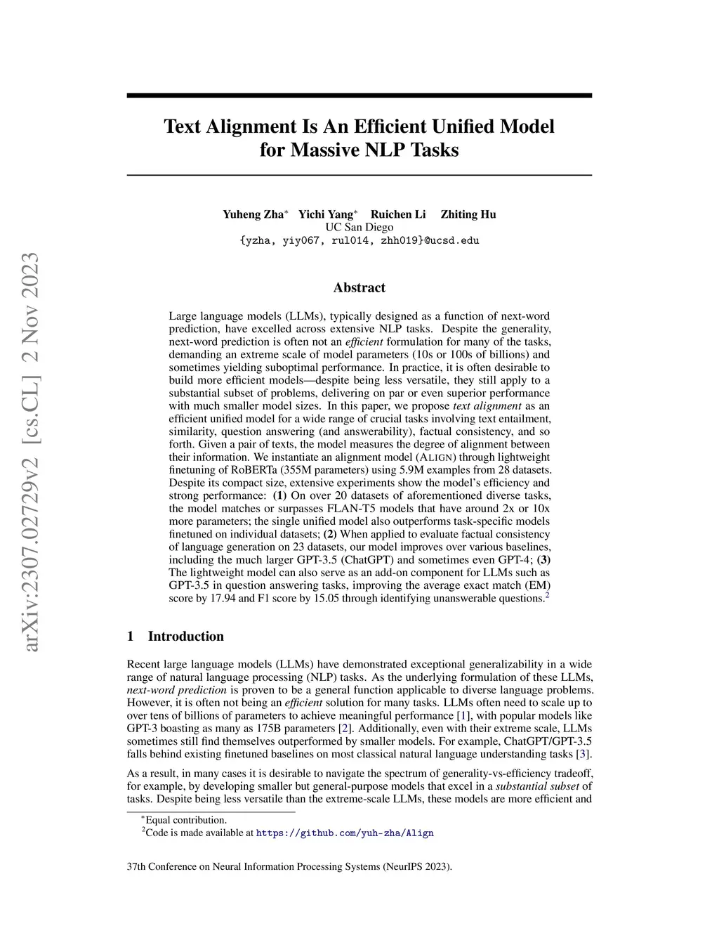 Large language models (LLMs), typically designed as a function of next-word prediction, have excelled across extensive NLP tasks. Despite the generality, next-word prediction is often not an efficient formulation for many of the tasks, demanding an extreme scale of model parameters (10s or 100s of billions) and sometimes yielding suboptimal performance. In practice, it is often desirable to build more efficient models -- despite being less versatile, they still apply to a substantial subset of problems, delivering on par or even superior performance with much smaller model sizes. In this paper, we propose text alignment as an efficient unified model for a wide range of crucial tasks involving text entailment, similarity, question answering (and answerability), factual consistency, and so forth. Given a pair of texts, the model measures the degree of alignment between their information. We instantiate an alignment model (Align) through lightweight finetuning of RoBERTa (355M parameters) using 5.9M examples from 28 datasets. Despite its compact size, extensive experiments show the model's efficiency and strong performance: (1) On over 20 datasets of aforementioned diverse tasks, the model matches or surpasses FLAN-T5 models that have around 2x or 10x more parameters; the single unified model also outperforms task-specific models finetuned on individual datasets; (2) When applied to evaluate factual consistency of language generation on 23 datasets, our model improves over various baselines, including the much larger GPT-3.5 (ChatGPT) and sometimes even GPT-4; (3) The lightweight model can also serve as an add-on component for LLMs such as GPT-3.5 in question answering tasks, improving the average exact match (EM) score by 17.94 and F1 score by 15.05 through identifying unanswerable questions.
