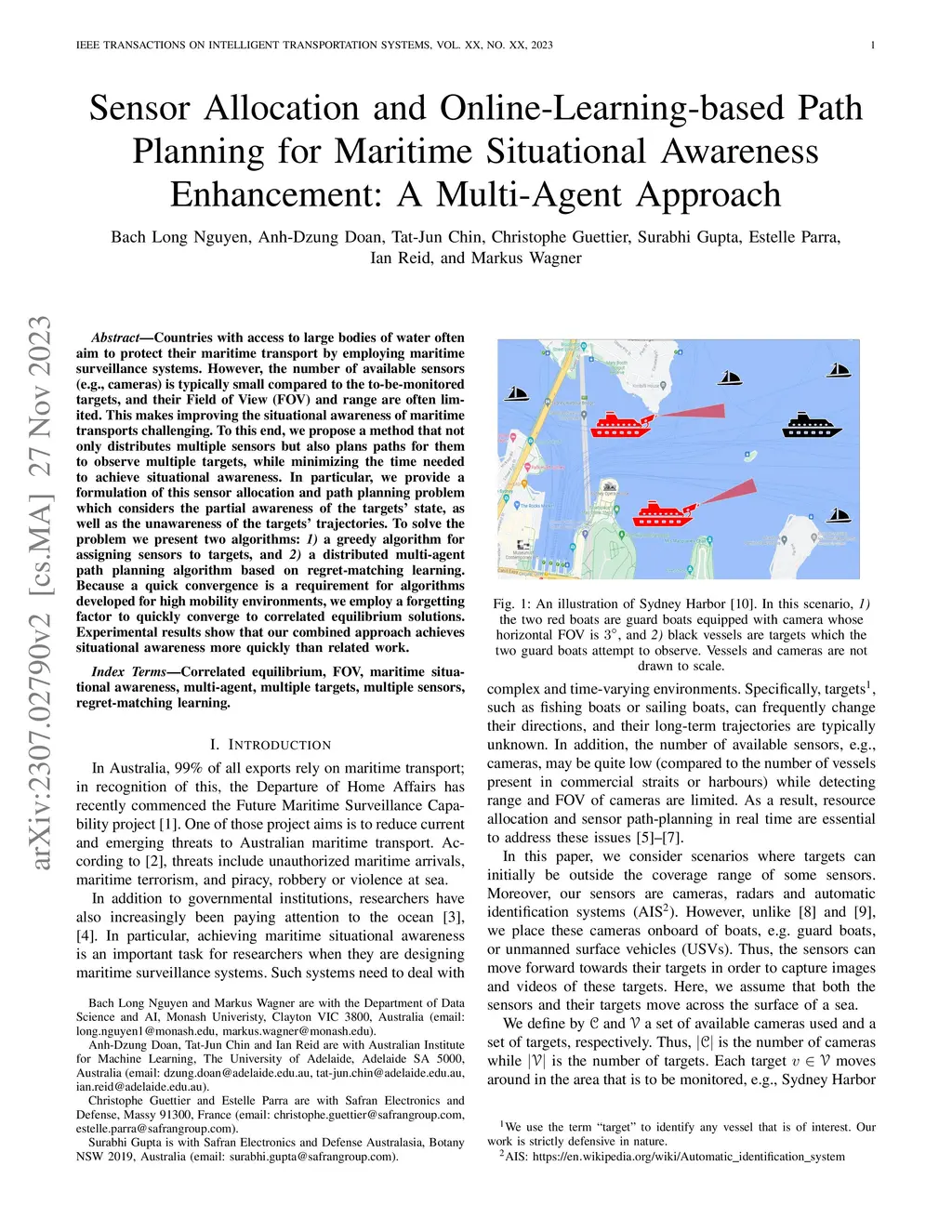 Countries with access to large bodies of water often aim to protect their maritime transport by employing maritime surveillance systems. However, the number of available sensors (e.g., cameras) is typically small compared to the to-be-monitored targets, and their Field of View (FOV) and range are often limited. This makes improving the situational awareness of maritime transports challenging. To this end, we propose a method that not only distributes multiple sensors but also plans paths for them to observe multiple targets, while minimizing the time needed to achieve situational awareness. In particular, we provide a formulation of this sensor allocation and path planning problem which considers the partial awareness of the targets' state, as well as the unawareness of the targets' trajectories. To solve the problem we present two algorithms: 1) a greedy algorithm for assigning sensors to targets, and 2) a distributed multi-agent path planning algorithm based on regret-matching learning. Because a quick convergence is a requirement for algorithms developed for high mobility environments, we employ a forgetting factor to quickly converge to correlated equilibrium solutions. Experimental results show that our combined approach achieves situational awareness more quickly than related work.
