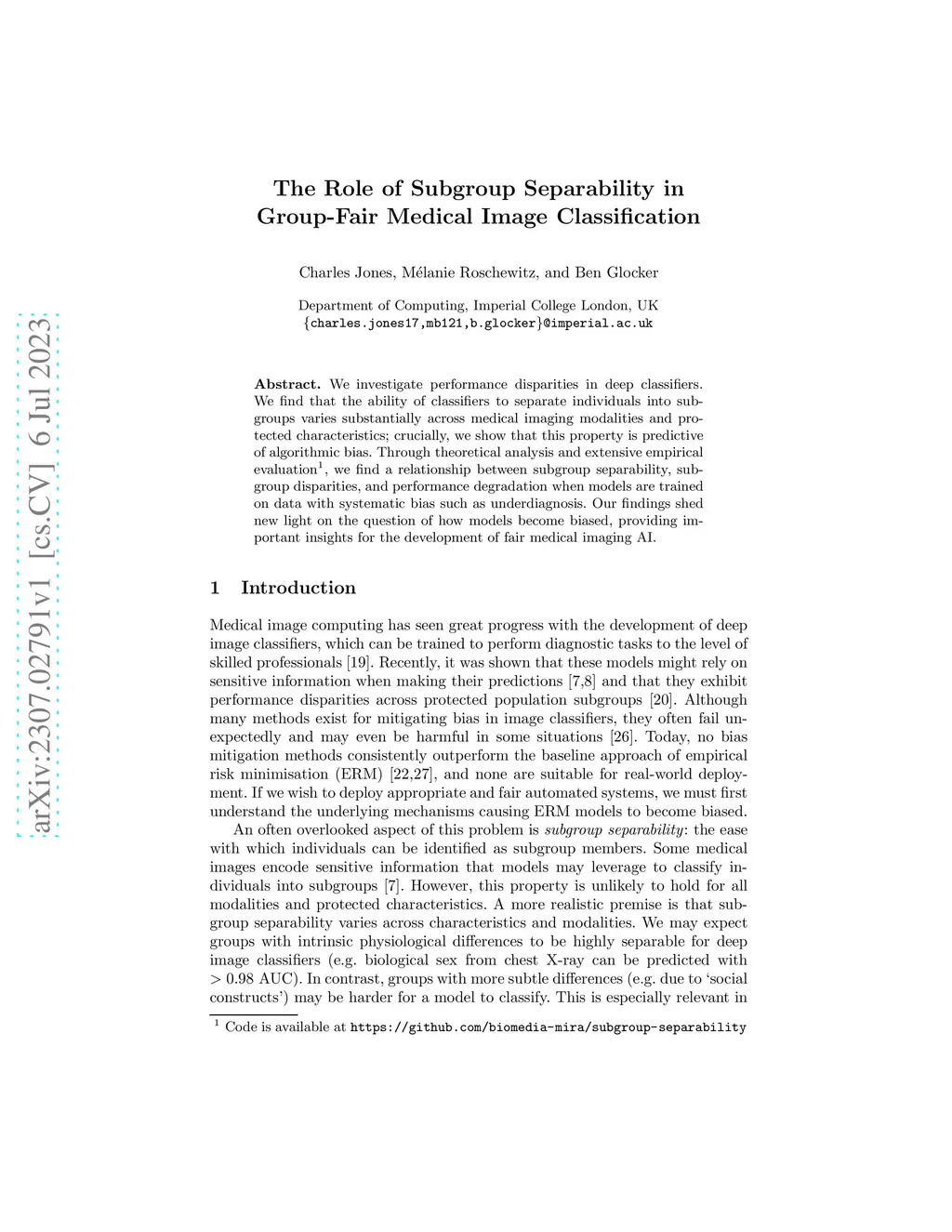 We investigate performance disparities in deep classifiers. We find that the ability of classifiers to separate individuals into subgroups varies substantially across medical imaging modalities and protected characteristics; crucially, we show that this property is predictive of algorithmic bias. Through theoretical analysis and extensive empirical evaluation, we find a relationship between subgroup separability, subgroup disparities, and performance degradation when models are trained on data with systematic bias such as underdiagnosis. Our findings shed new light on the question of how models become biased, providing important insights for the development of fair medical imaging AI.