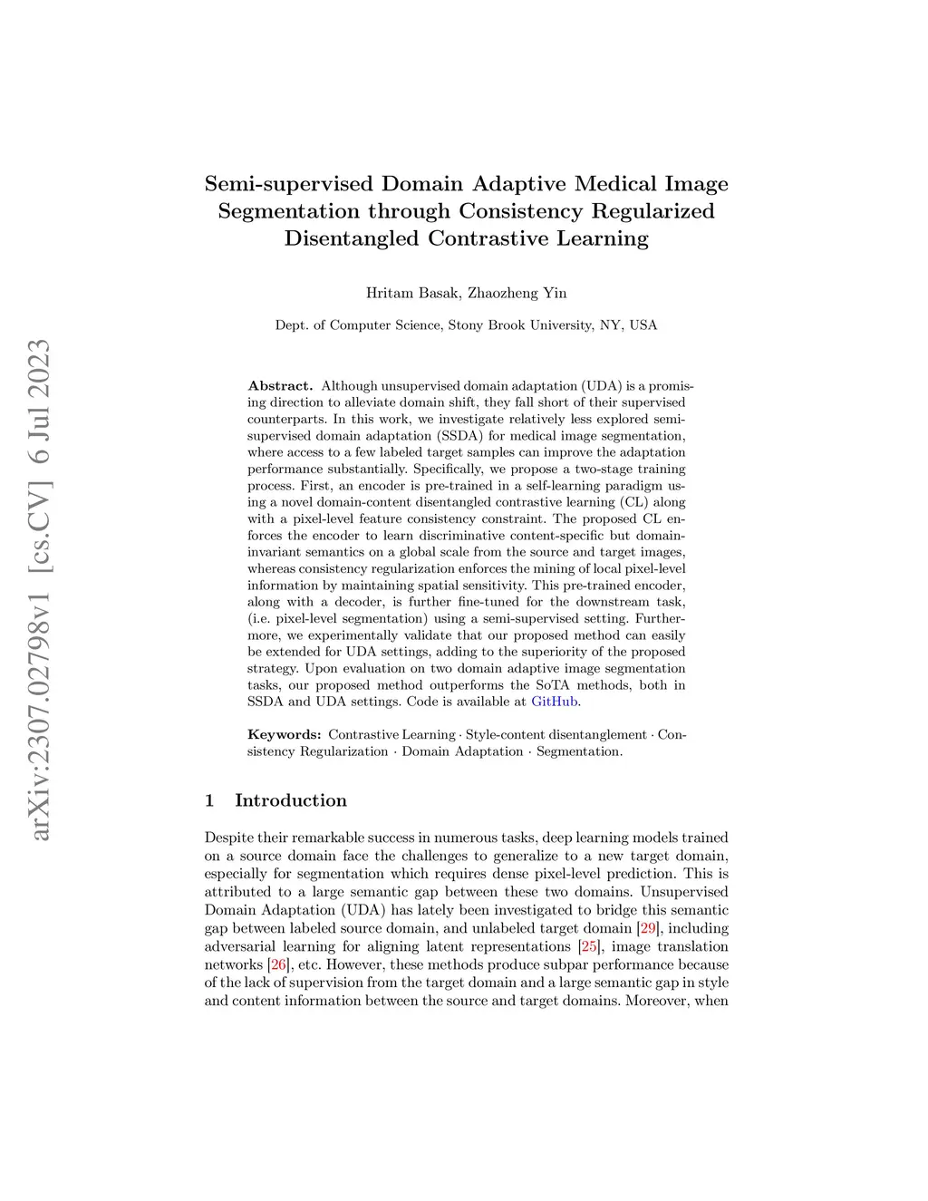 Although unsupervised domain adaptation (UDA) is a promising direction to alleviate domain shift, they fall short of their supervised counterparts. In this work, we investigate relatively less explored semi-supervised domain adaptation (SSDA) for medical image segmentation, where access to a few labeled target samples can improve the adaptation performance substantially. Specifically, we propose a two-stage training process. First, an encoder is pre-trained in a self-learning paradigm using a novel domain-content disentangled contrastive learning (CL) along with a pixel-level feature consistency constraint. The proposed CL enforces the encoder to learn discriminative content-specific but domain-invariant semantics on a global scale from the source and target images, whereas consistency regularization enforces the mining of local pixel-level information by maintaining spatial sensitivity. This pre-trained encoder, along with a decoder, is further fine-tuned for the downstream task, (i.e. pixel-level segmentation) using a semi-supervised setting. Furthermore, we experimentally validate that our proposed method can easily be extended for UDA settings, adding to the superiority of the proposed strategy. Upon evaluation on two domain adaptive image segmentation tasks, our proposed method outperforms the SoTA methods, both in SSDA and UDA settings. Code is available at https://github.com/hritam-98/GFDA-disentangled