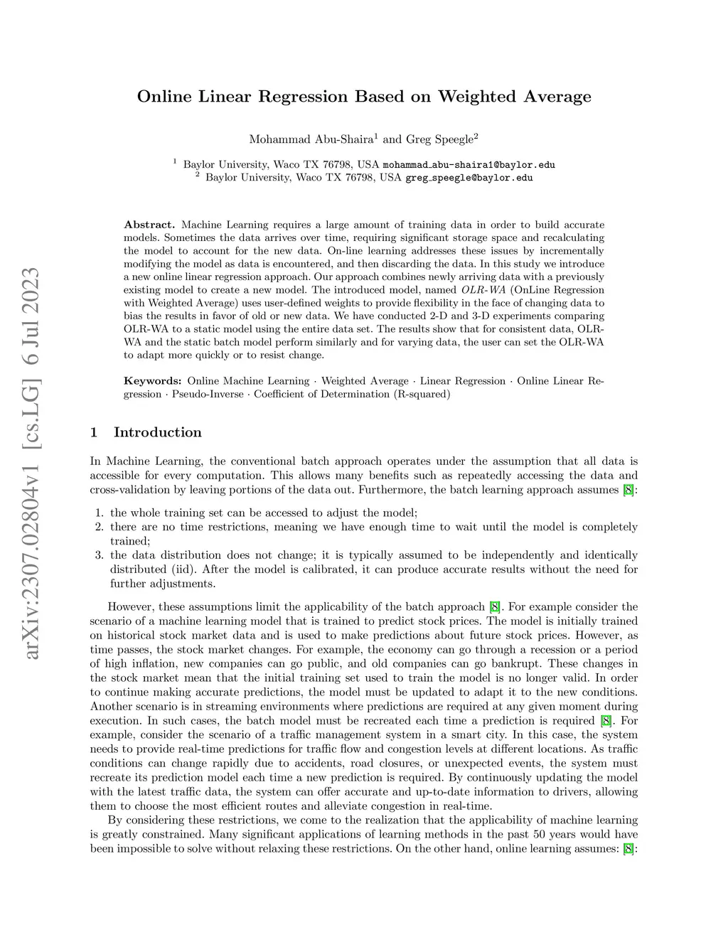 Machine Learning requires a large amount of training data in order to build accurate models. Sometimes the data arrives over time, requiring significant storage space and recalculating the model to account for the new data. On-line learning addresses these issues by incrementally modifying the model as data is encountered, and then discarding the data. In this study we introduce a new online linear regression approach. Our approach combines newly arriving data with a previously existing model to create a new model. The introduced model, named OLR-WA (OnLine Regression with Weighted Average) uses user-defined weights to provide flexibility in the face of changing data to bias the results in favor of old or new data. We have conducted 2-D and 3-D experiments comparing OLR-WA to a static model using the entire data set. The results show that for consistent data, OLR-WA and the static batch model perform similarly and for varying data, the user can set the OLR-WA to adapt more quickly or to resist change.