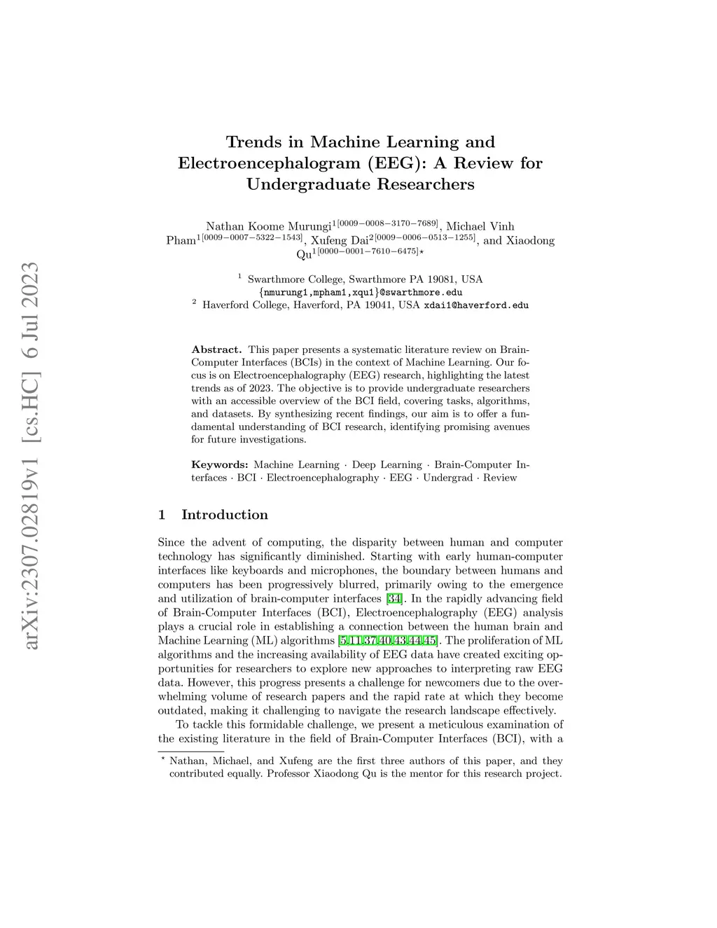 This paper presents a systematic literature review on Brain-Computer Interfaces (BCIs) in the context of Machine Learning. Our focus is on Electroencephalography (EEG) research, highlighting the latest trends as of 2023. The objective is to provide undergraduate researchers with an accessible overview of the BCI field, covering tasks, algorithms, and datasets. By synthesizing recent findings, our aim is to offer a fundamental understanding of BCI research, identifying promising avenues for future investigations.