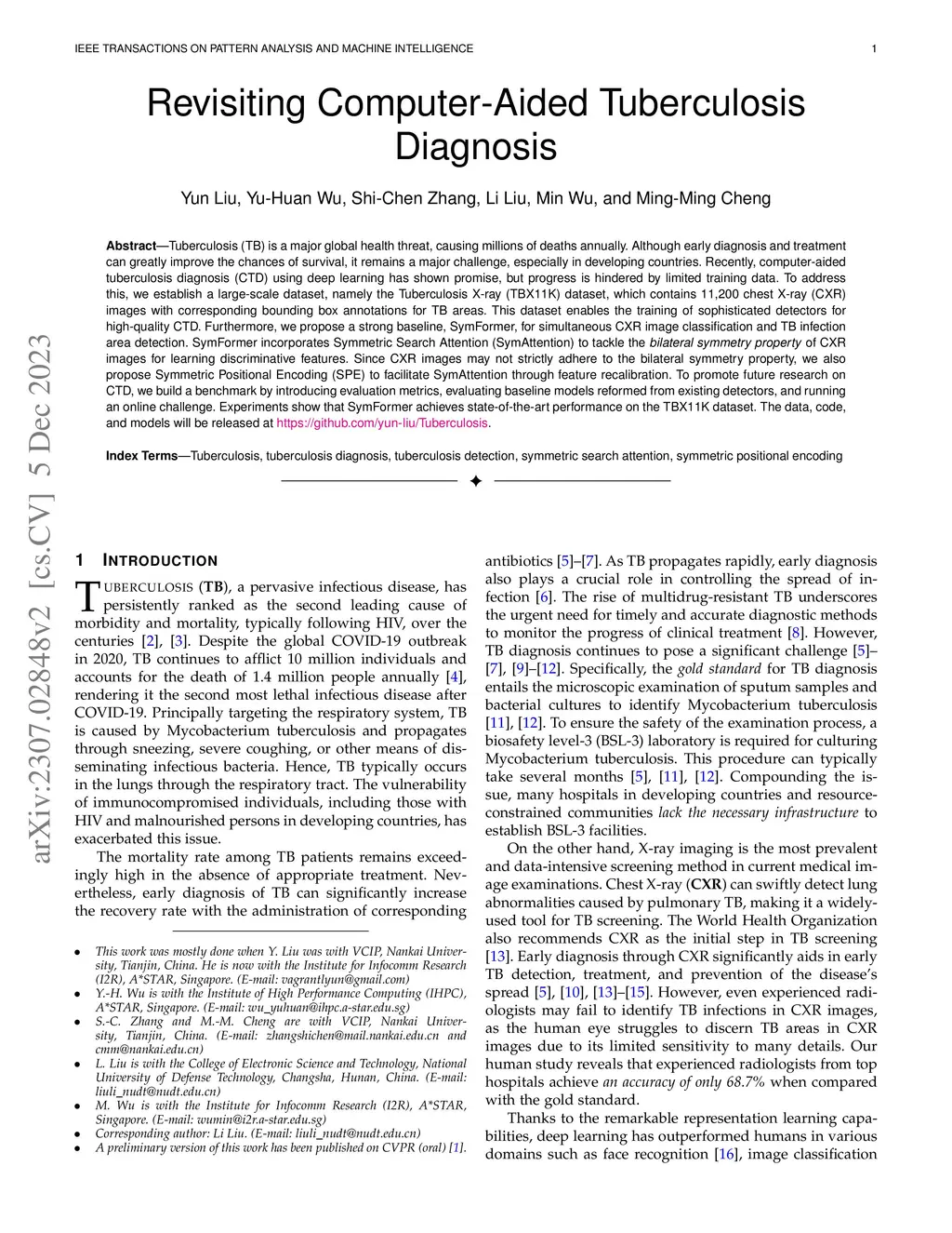Tuberculosis (TB) is a major global health threat, causing millions of deaths annually. Although early diagnosis and treatment can greatly improve the chances of survival, it remains a major challenge, especially in developing countries. Recently, computer-aided tuberculosis diagnosis (CTD) using deep learning has shown promise, but progress is hindered by limited training data. To address this, we establish a large-scale dataset, namely the Tuberculosis X-ray (TBX11K) dataset, which contains 11,200 chest X-ray (CXR) images with corresponding bounding box annotations for TB areas. This dataset enables the training of sophisticated detectors for high-quality CTD. Furthermore, we propose a strong baseline, SymFormer, for simultaneous CXR image classification and TB infection area detection. SymFormer incorporates Symmetric Search Attention (SymAttention) to tackle the bilateral symmetry property of CXR images for learning discriminative features. Since CXR images may not strictly adhere to the bilateral symmetry property, we also propose Symmetric Positional Encoding (SPE) to facilitate SymAttention through feature recalibration. To promote future research on CTD, we build a benchmark by introducing evaluation metrics, evaluating baseline models reformed from existing detectors, and running an online challenge. Experiments show that SymFormer achieves state-of-the-art performance on the TBX11K dataset. The data, code, and models will be released at https://github.com/yun-liu/Tuberculosis.