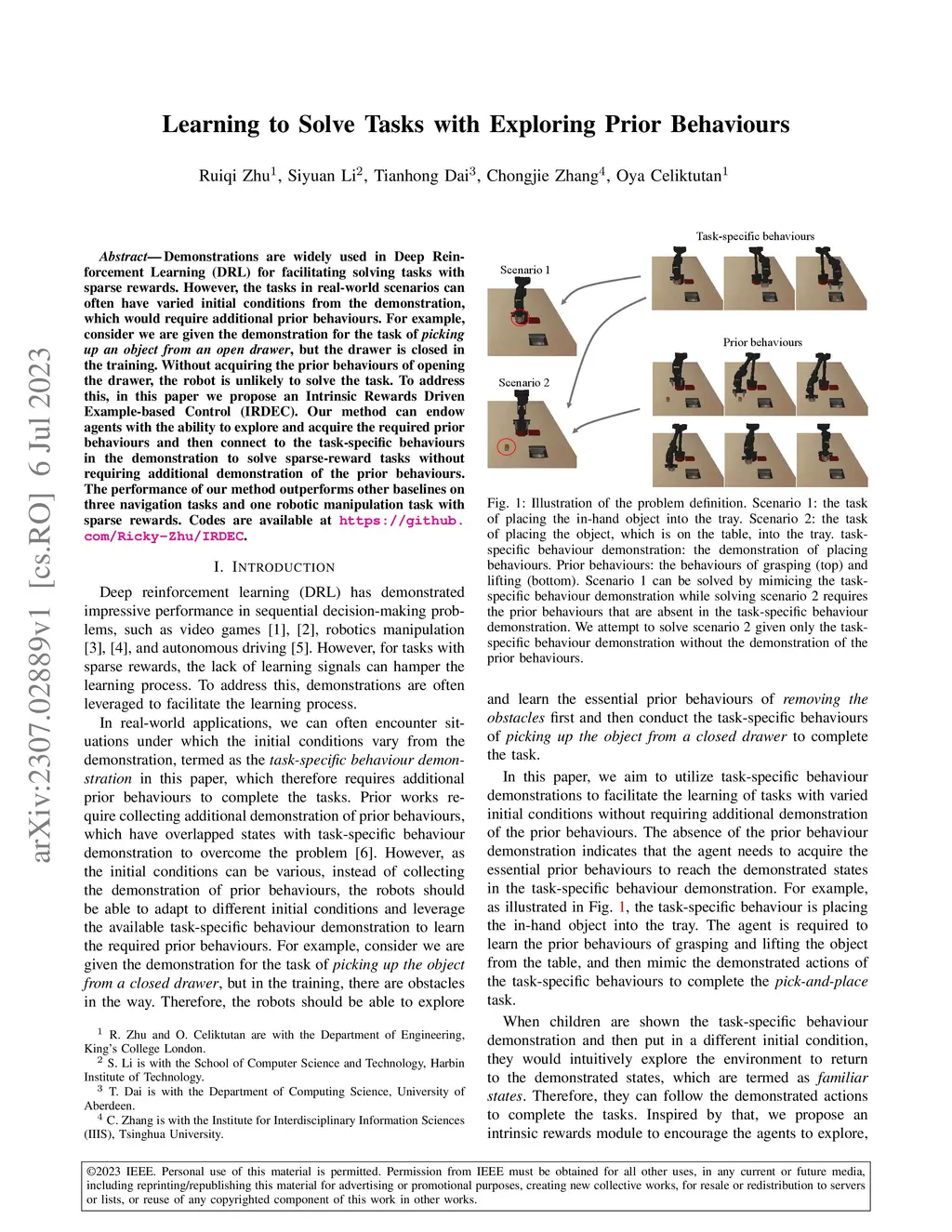 Demonstrations are widely used in Deep Reinforcement Learning (DRL) for facilitating solving tasks with sparse rewards. However, the tasks in real-world scenarios can often have varied initial conditions from the demonstration, which would require additional prior behaviours. For example, consider we are given the demonstration for the task of \emph{picking up an object from an open drawer}, but the drawer is closed in the training. Without acquiring the prior behaviours of opening the drawer, the robot is unlikely to solve the task. To address this, in this paper we propose an Intrinsic Rewards Driven Example-based Control \textbf{(IRDEC)}. Our method can endow agents with the ability to explore and acquire the required prior behaviours and then connect to the task-specific behaviours in the demonstration to solve sparse-reward tasks without requiring additional demonstration of the prior behaviours. The performance of our method outperforms other baselines on three navigation tasks and one robotic manipulation task with sparse rewards. Codes are available at https://github.com/Ricky-Zhu/IRDEC.