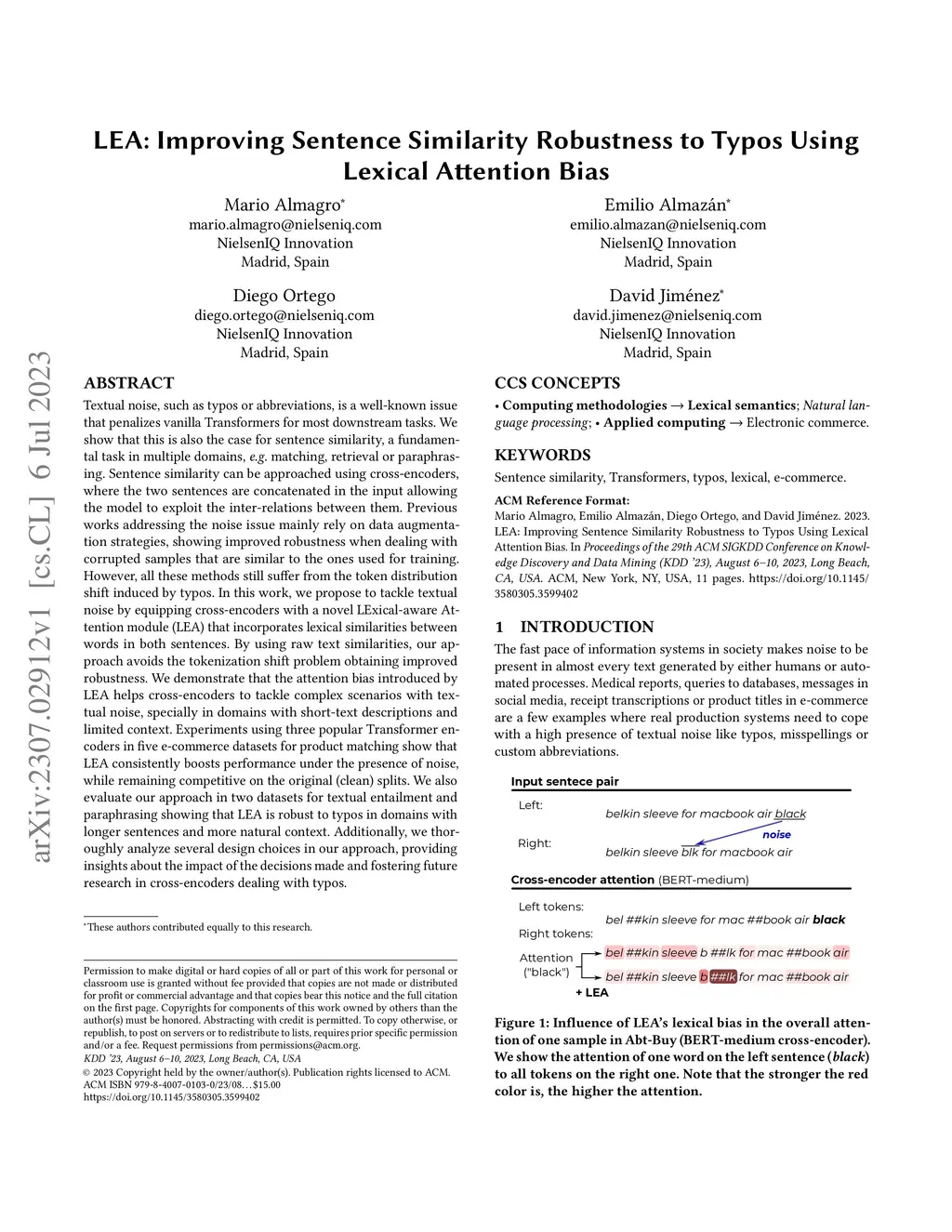 Textual noise, such as typos or abbreviations, is a well-known issue that penalizes vanilla Transformers for most downstream tasks. We show that this is also the case for sentence similarity, a fundamental task in multiple domains, e.g. matching, retrieval or paraphrasing. Sentence similarity can be approached using cross-encoders, where the two sentences are concatenated in the input allowing the model to exploit the inter-relations between them. Previous works addressing the noise issue mainly rely on data augmentation strategies, showing improved robustness when dealing with corrupted samples that are similar to the ones used for training. However, all these methods still suffer from the token distribution shift induced by typos. In this work, we propose to tackle textual noise by equipping cross-encoders with a novel LExical-aware Attention module (LEA) that incorporates lexical similarities between words in both sentences. By using raw text similarities, our approach avoids the tokenization shift problem obtaining improved robustness. We demonstrate that the attention bias introduced by LEA helps cross-encoders to tackle complex scenarios with textual noise, specially in domains with short-text descriptions and limited context. Experiments using three popular Transformer encoders in five e-commerce datasets for product matching show that LEA consistently boosts performance under the presence of noise, while remaining competitive on the original (clean) splits. We also evaluate our approach in two datasets for textual entailment and paraphrasing showing that LEA is robust to typos in domains with longer sentences and more natural context. Additionally, we thoroughly analyze several design choices in our approach, providing insights about the impact of the decisions made and fostering future research in cross-encoders dealing with typos.