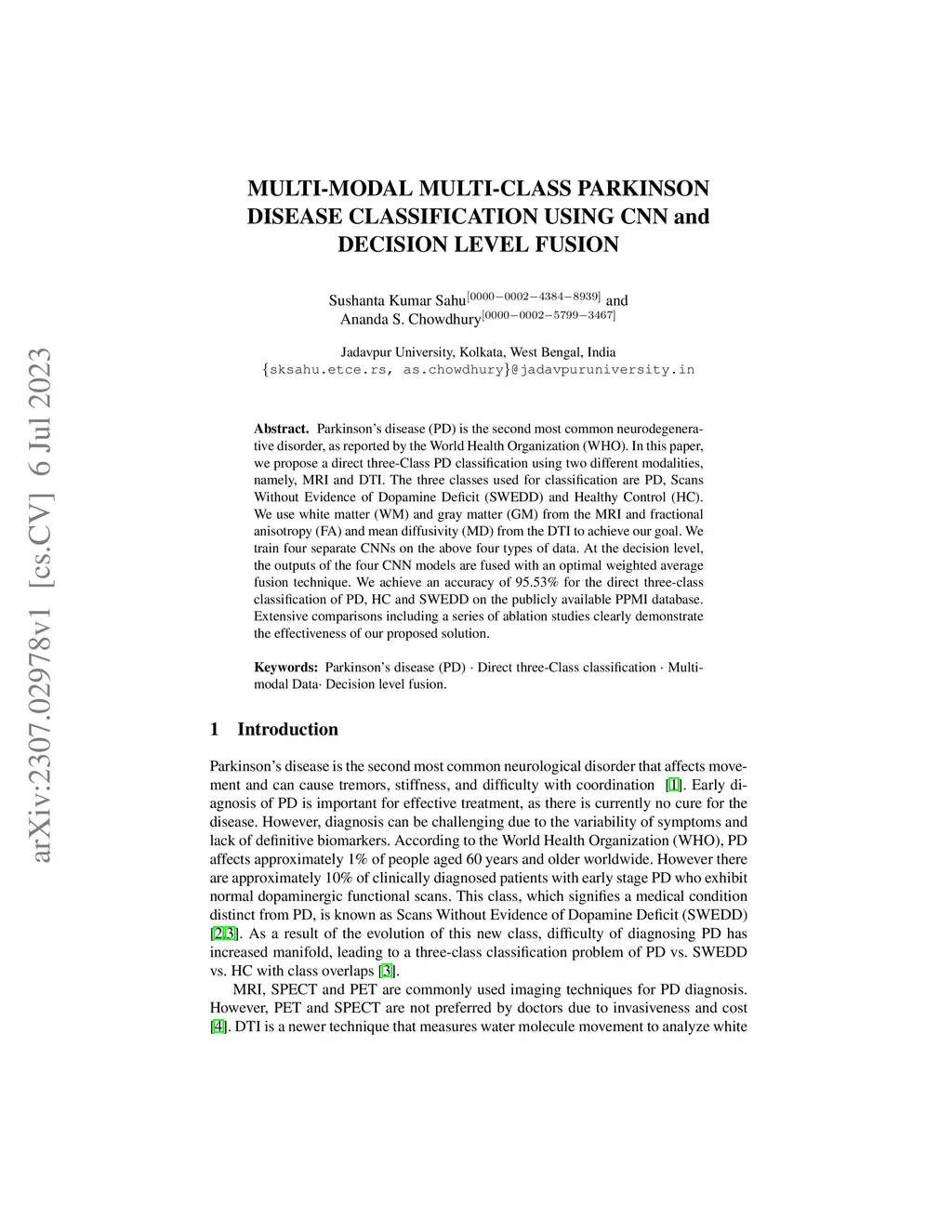 Parkinson disease is the second most common neurodegenerative disorder, as reported by the World Health Organization. In this paper, we propose a direct three-Class PD classification using two different modalities, namely, MRI and DTI. The three classes used for classification are PD, Scans Without Evidence of Dopamine Deficit and Healthy Control. We use white matter and gray matter from the MRI and fractional anisotropy and mean diffusivity from the DTI to achieve our goal. We train four separate CNNs on the above four types of data. At the decision level, the outputs of the four CNN models are fused with an optimal weighted average fusion technique. We achieve an accuracy of 95.53 percentage for the direct three class classification of PD, HC and SWEDD on the publicly available PPMI database. Extensive comparisons including a series of ablation studies clearly demonstrate the effectiveness of our proposed solution.