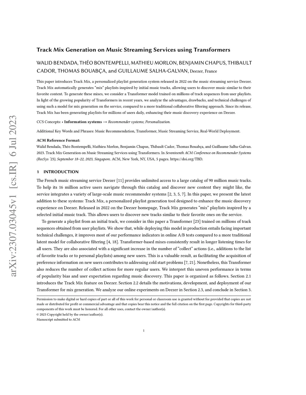This paper introduces Track Mix, a personalized playlist generation system released in 2022 on the music streaming service Deezer. Track Mix automatically generates "mix" playlists inspired by initial music tracks, allowing users to discover music similar to their favorite content. To generate these mixes, we consider a Transformer model trained on millions of track sequences from user playlists. In light of the growing popularity of Transformers in recent years, we analyze the advantages, drawbacks, and technical challenges of using such a model for mix generation on the service, compared to a more traditional collaborative filtering approach. Since its release, Track Mix has been generating playlists for millions of users daily, enhancing their music discovery experience on Deezer.