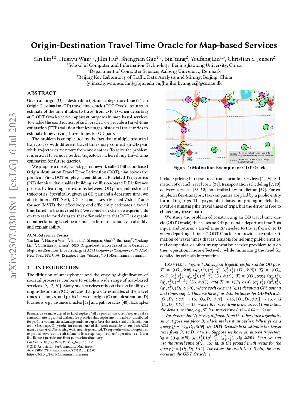 Given an origin (O), a destination (D), and a departure time (T), an Origin-Destination (OD) travel time oracle~(ODT-Oracle) returns an estimate of the time it takes to travel from O to D when departing at T. ODT-Oracles serve important purposes in map-based services. To enable the construction of such oracles, we provide a travel-time estimation (TTE) solution that leverages historical trajectories to estimate time-varying travel times for OD pairs. The problem is complicated by the fact that multiple historical trajectories with different travel times may connect an OD pair, while trajectories may vary from one another. To solve the problem, it is crucial to remove outlier trajectories when doing travel time estimation for future queries. We propose a novel, two-stage framework called Diffusion-based Origin-destination Travel Time Estimation (DOT), that solves the problem. First, DOT employs a conditioned Pixelated Trajectories (PiT) denoiser that enables building a diffusion-based PiT inference process by learning correlations between OD pairs and historical trajectories. Specifically, given an OD pair and a departure time, we aim to infer a PiT. Next, DOT encompasses a Masked Vision Transformer~(MViT) that effectively and efficiently estimates a travel time based on the inferred PiT. We report on extensive experiments on two real-world datasets that offer evidence that DOT is capable of outperforming baseline methods in terms of accuracy, scalability, and explainability.