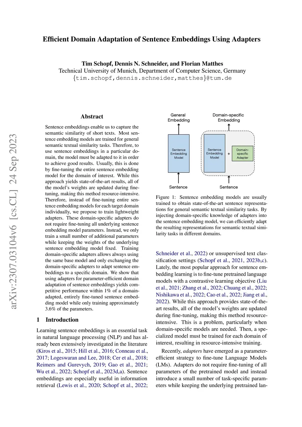 Efficient Domain Adaptation of Sentence Embeddings Using Adapters