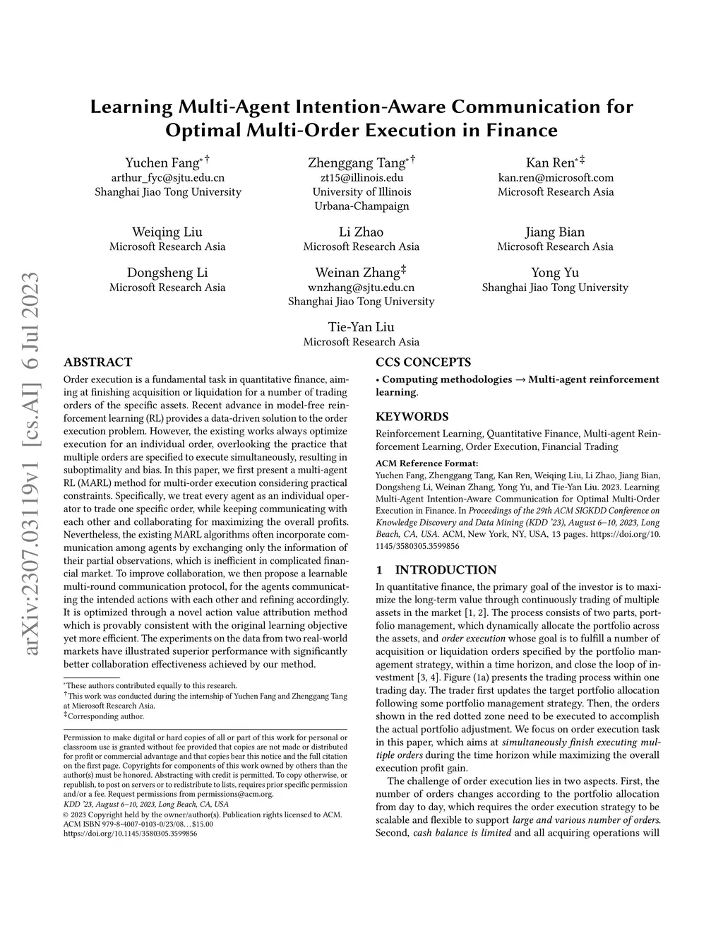 Order execution is a fundamental task in quantitative finance, aiming at finishing acquisition or liquidation for a number of trading orders of the specific assets. Recent advance in model-free reinforcement learning (RL) provides a data-driven solution to the order execution problem. However, the existing works always optimize execution for an individual order, overlooking the practice that multiple orders are specified to execute simultaneously, resulting in suboptimality and bias. In this paper, we first present a multi-agent RL (MARL) method for multi-order execution considering practical constraints. Specifically, we treat every agent as an individual operator to trade one specific order, while keeping communicating with each other and collaborating for maximizing the overall profits. Nevertheless, the existing MARL algorithms often incorporate communication among agents by exchanging only the information of their partial observations, which is inefficient in complicated financial market. To improve collaboration, we then propose a learnable multi-round communication protocol, for the agents communicating the intended actions with each other and refining accordingly. It is optimized through a novel action value attribution method which is provably consistent with the original learning objective yet more efficient. The experiments on the data from two real-world markets have illustrated superior performance with significantly better collaboration effectiveness achieved by our method.