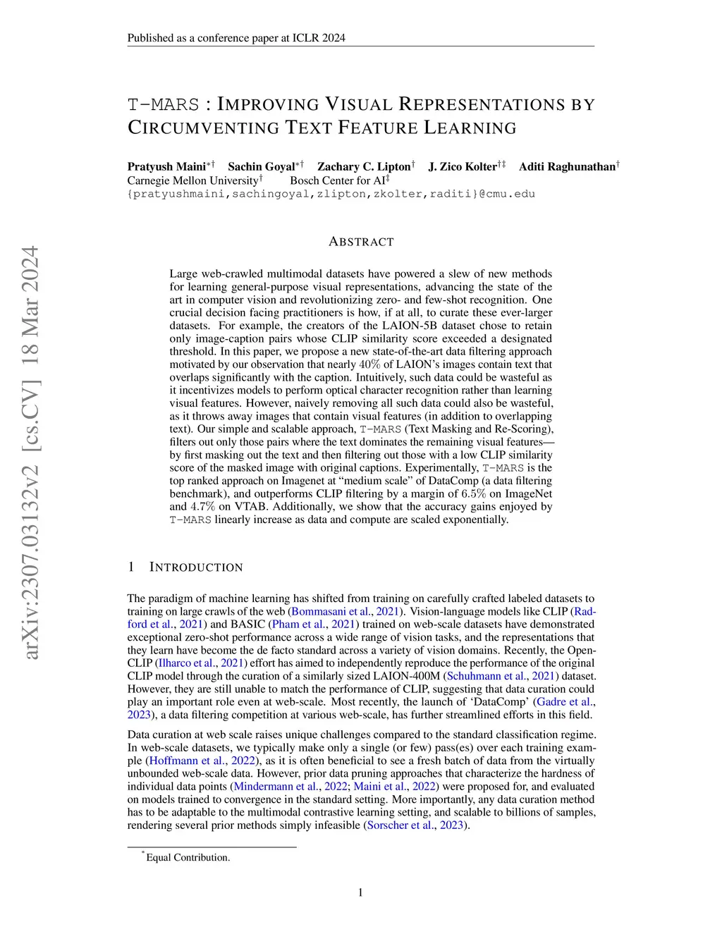 Large web-sourced multimodal datasets have powered a slew of new methods for learning general-purpose visual representations, advancing the state of the art in computer vision and revolutionizing zero- and few-shot recognition. One crucial decision facing practitioners is how, if at all, to curate these ever-larger datasets. For example, the creators of the LAION-5B dataset chose to retain only image-caption pairs whose CLIP similarity score exceeded a designated threshold. In this paper, we propose a new state-of-the-art data filtering approach motivated by our observation that nearly 40% of LAION's images contain text that overlaps significantly with the caption. Intuitively, such data could be wasteful as it incentivizes models to perform optical character recognition rather than learning visual features. However, naively removing all such data could also be wasteful, as it throws away images that contain visual features (in addition to overlapping text). Our simple and scalable approach, T-MARS (Text Masking and Re-Scoring), filters out only those pairs where the text dominates the remaining visual features -- by first masking out the text and then filtering out those with a low CLIP similarity score of the masked image. Experimentally, T-MARS outperforms the top-ranked method on the "medium scale" of DataComp (a data filtering benchmark) by a margin of 6.5% on ImageNet and 4.7% on VTAB. Additionally, our systematic evaluation on various data pool sizes from 2M to 64M shows that the accuracy gains enjoyed by T-MARS linearly increase as data and compute are scaled exponentially. Code is available at https://github.com/locuslab/T-MARS.
