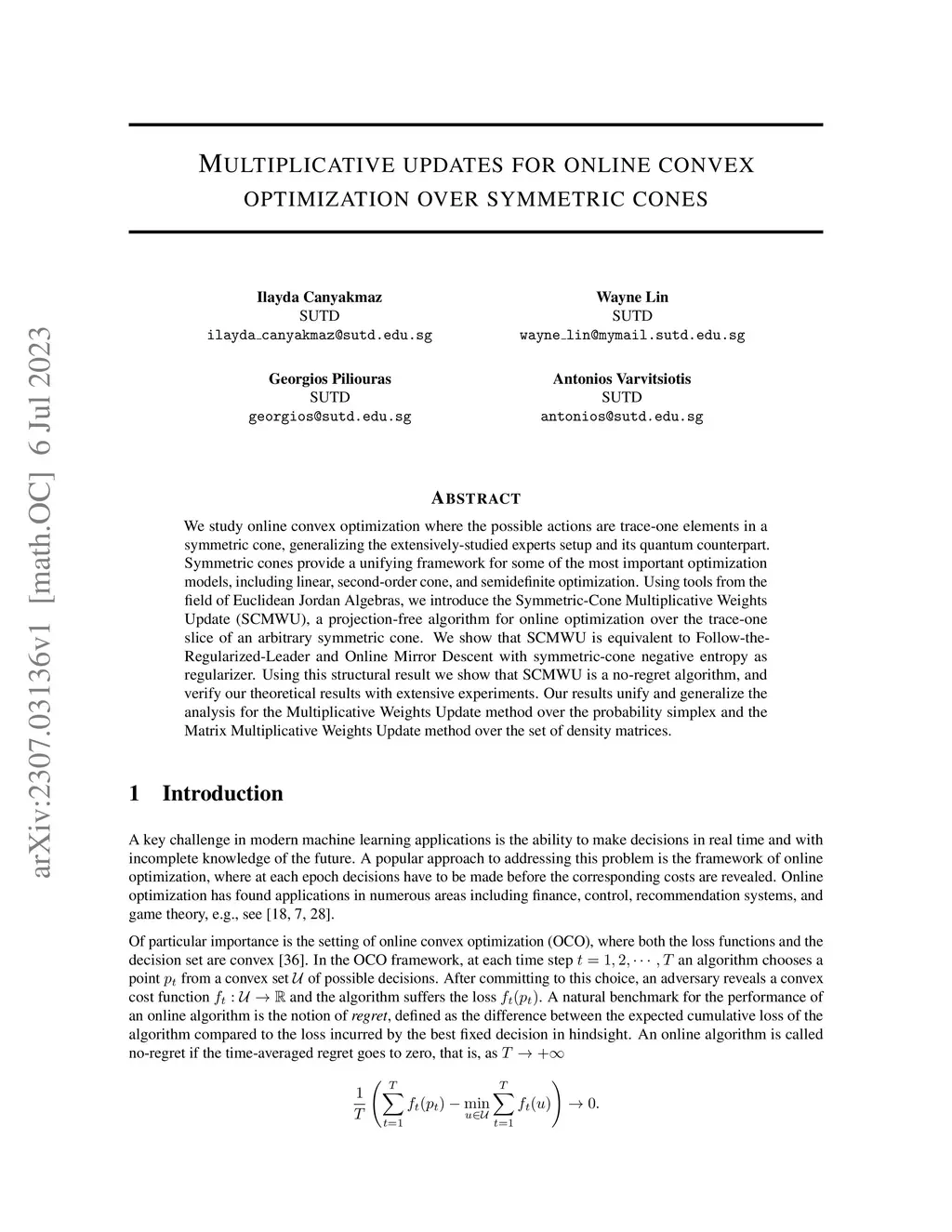 We study online convex optimization where the possible actions are trace-one elements in a symmetric cone, generalizing the extensively-studied experts setup and its quantum counterpart. Symmetric cones provide a unifying framework for some of the most important optimization models, including linear, second-order cone, and semidefinite optimization. Using tools from the field of Euclidean Jordan Algebras, we introduce the Symmetric-Cone Multiplicative Weights Update (SCMWU), a projection-free algorithm for online optimization over the trace-one slice of an arbitrary symmetric cone. We show that SCMWU is equivalent to Follow-the-Regularized-Leader and Online Mirror Descent with symmetric-cone negative entropy as regularizer. Using this structural result we show that SCMWU is a no-regret algorithm, and verify our theoretical results with extensive experiments. Our results unify and generalize the analysis for the Multiplicative Weights Update method over the probability simplex and the Matrix Multiplicative Weights Update method over the set of density matrices.