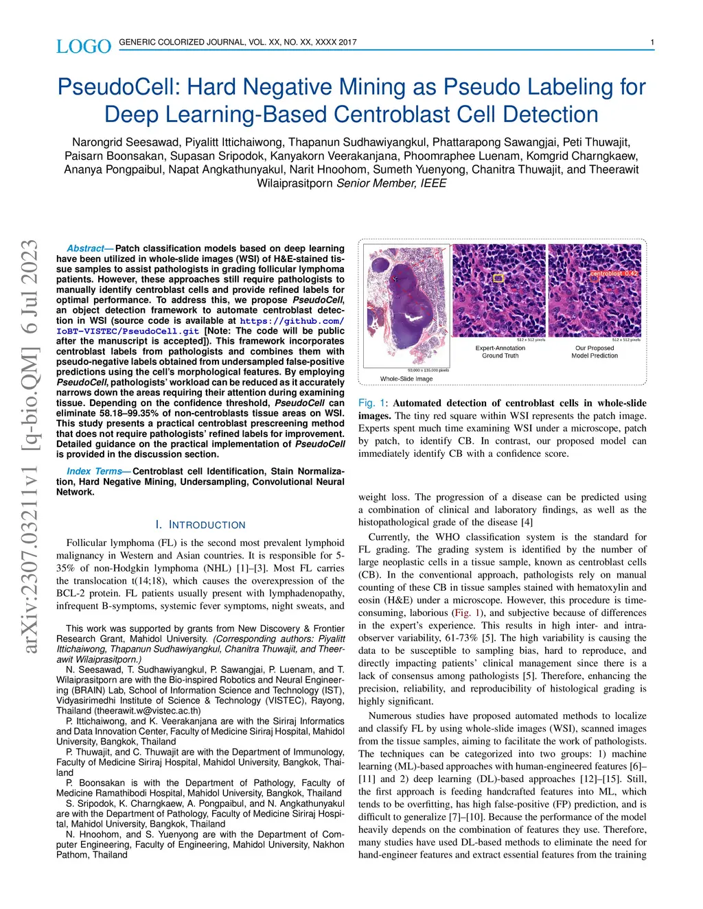Patch classification models based on deep learning have been utilized in whole-slide images (WSI) of H&E-stained tissue samples to assist pathologists in grading follicular lymphoma patients. However, these approaches still require pathologists to manually identify centroblast cells and provide refined labels for optimal performance. To address this, we propose PseudoCell, an object detection framework to automate centroblast detection in WSI (source code is available at https://github.com/IoBT-VISTEC/PseudoCell.git). This framework incorporates centroblast labels from pathologists and combines them with pseudo-negative labels obtained from undersampled false-positive predictions using the cell's morphological features. By employing PseudoCell, pathologists' workload can be reduced as it accurately narrows down the areas requiring their attention during examining tissue. Depending on the confidence threshold, PseudoCell can eliminate 58.18-99.35% of non-centroblasts tissue areas on WSI. This study presents a practical centroblast prescreening method that does not require pathologists' refined labels for improvement. Detailed guidance on the practical implementation of PseudoCell is provided in the discussion section.