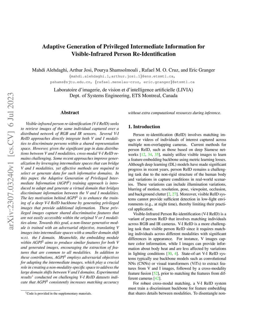 Visible-infrared person re-identification seeks to retrieve images of the same individual captured over a distributed network of RGB and IR sensors. Several V-I ReID approaches directly integrate both V and I modalities to discriminate persons within a shared representation space. However, given the significant gap in data distributions between V and I modalities, cross-modal V-I ReID remains challenging. Some recent approaches improve generalization by leveraging intermediate spaces that can bridge V and I modalities, yet effective methods are required to select or generate data for such informative domains. In this paper, the Adaptive Generation of Privileged Intermediate Information training approach is introduced to adapt and generate a virtual domain that bridges discriminant information between the V and I modalities. The key motivation behind AGPI^2 is to enhance the training of a deep V-I ReID backbone by generating privileged images that provide additional information. These privileged images capture shared discriminative features that are not easily accessible within the original V or I modalities alone. Towards this goal, a non-linear generative module is trained with an adversarial objective, translating V images into intermediate spaces with a smaller domain shift w.r.t. the I domain. Meanwhile, the embedding module within AGPI^2 aims to produce similar features for both V and generated images, encouraging the extraction of features that are common to all modalities. In addition to these contributions, AGPI^2 employs adversarial objectives for adapting the intermediate images, which play a crucial role in creating a non-modality-specific space to address the large domain shifts between V and I domains. Experimental results conducted on challenging V-I ReID datasets indicate that AGPI^2 increases matching accuracy without extra computational resources during inference.