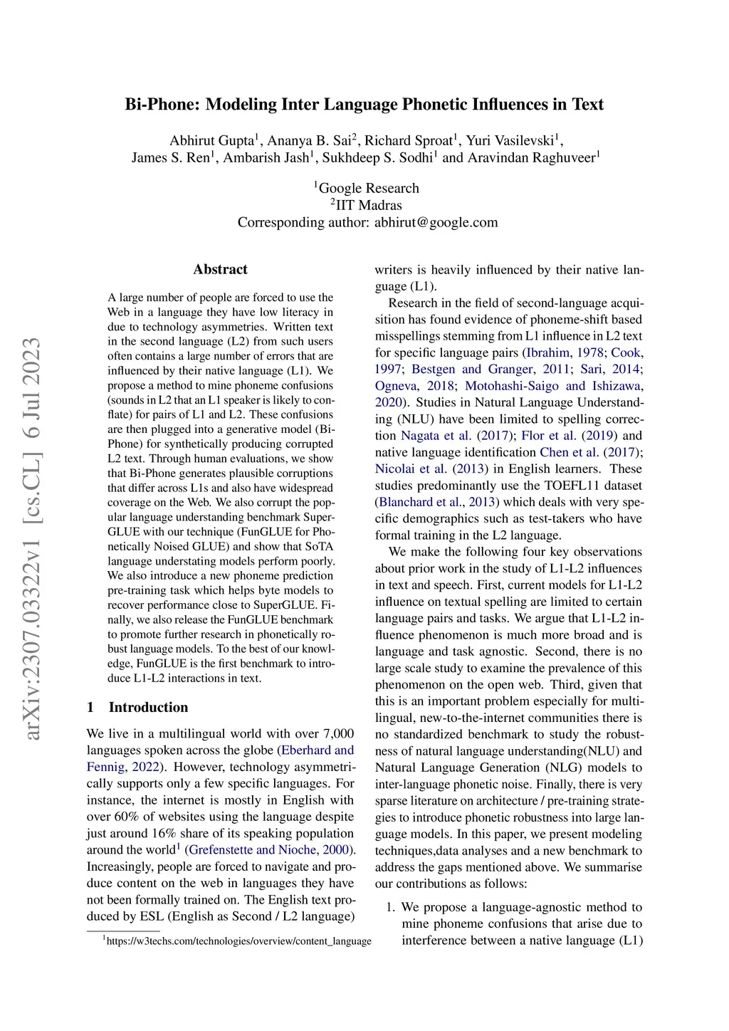 A large number of people are forced to use the Web in a language they have low literacy in due to technology asymmetries. Written text in the second language (L2) from such users often contains a large number of errors that are influenced by their native language (L1). We propose a method to mine phoneme confusions (sounds in L2 that an L1 speaker is likely to conflate) for pairs of L1 and L2. These confusions are then plugged into a generative model (Bi-Phone) for synthetically producing corrupted L2 text. Through human evaluations, we show that Bi-Phone generates plausible corruptions that differ across L1s and also have widespread coverage on the Web. We also corrupt the popular language understanding benchmark SuperGLUE with our technique (FunGLUE for Phonetically Noised GLUE) and show that SoTA language understating models perform poorly. We also introduce a new phoneme prediction pre-training task which helps byte models to recover performance close to SuperGLUE. Finally, we also release the FunGLUE benchmark to promote further research in phonetically robust language models. To the best of our knowledge, FunGLUE is the first benchmark to introduce L1-L2 interactions in text.