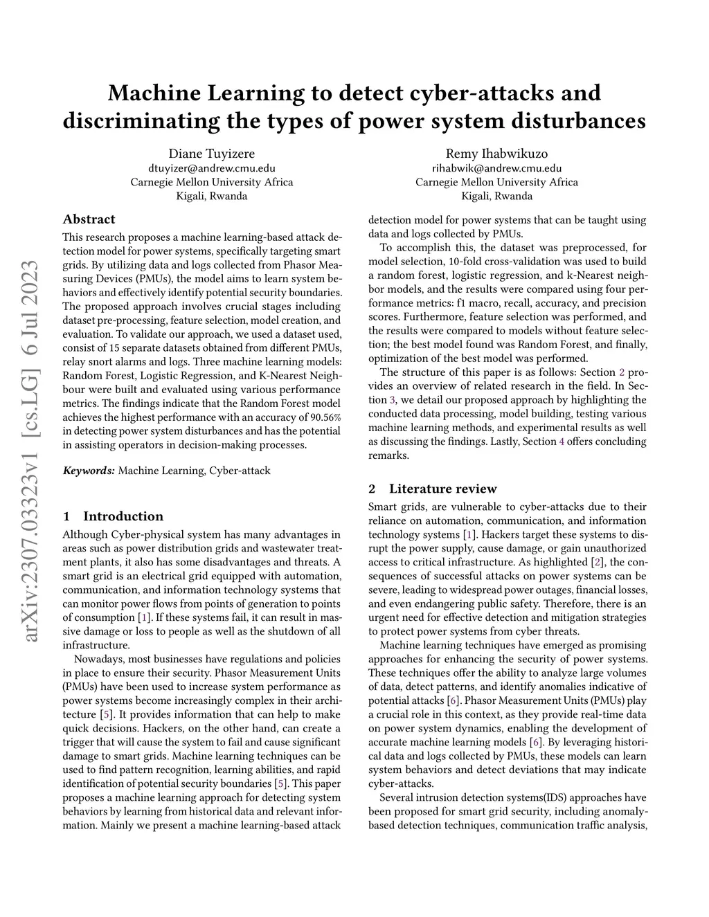 This research proposes a machine learning-based attack detection model for power systems, specifically targeting smart grids. By utilizing data and logs collected from Phasor Measuring Devices (PMUs), the model aims to learn system behaviors and effectively identify potential security boundaries. The proposed approach involves crucial stages including dataset pre-processing, feature selection, model creation, and evaluation. To validate our approach, we used a dataset used, consist of 15 separate datasets obtained from different PMUs, relay snort alarms and logs. Three machine learning models: Random Forest, Logistic Regression, and K-Nearest Neighbour were built and evaluated using various performance metrics. The findings indicate that the Random Forest model achieves the highest performance with an accuracy of 90.56% in detecting power system disturbances and has the potential in assisting operators in decision-making processes.