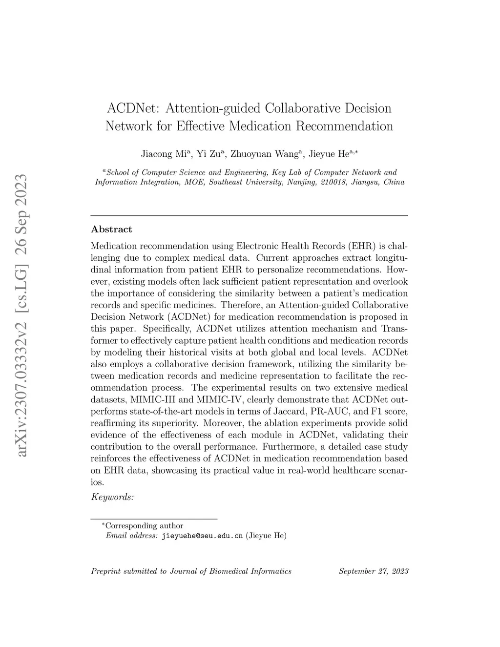 Medication recommendation using Electronic Health Records (EHR) is challenging due to complex medical data. Current approaches extract longitudinal information from patient EHR to personalize recommendations. However, existing models often lack sufficient patient representation and overlook the importance of considering the similarity between a patient's medication records and specific medicines. Therefore, an Attention-guided Collaborative Decision Network (ACDNet) for medication recommendation is proposed in this paper. Specifically, ACDNet utilizes attention mechanism and Transformer to effectively capture patient health conditions and medication records by modeling their historical visits at both global and local levels. ACDNet also employs a collaborative decision framework, utilizing the similarity between medication records and medicine representation to facilitate the recommendation process. The experimental results on two extensive medical datasets, MIMIC-III and MIMIC-IV, clearly demonstrate that ACDNet outperforms state-of-the-art models in terms of Jaccard, PR-AUC, and F1 score, reaffirming its superiority. Moreover, the ablation experiments provide solid evidence of the effectiveness of each module in ACDNet, validating their contribution to the overall performance. Furthermore, a detailed case study reinforces the effectiveness of ACDNet in medication recommendation based on EHR data, showcasing its practical value in real-world healthcare scenarios.