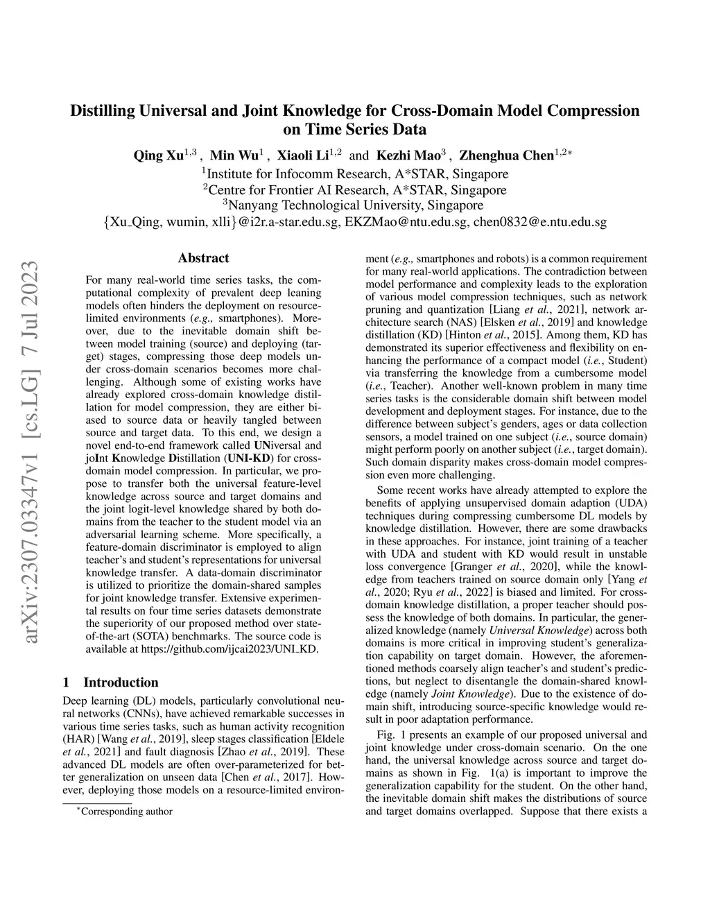 For many real-world time series tasks, the computational complexity of prevalent deep leaning models often hinders the deployment on resource-limited environments (e.g., smartphones). Moreover, due to the inevitable domain shift between model training (source) and deploying (target) stages, compressing those deep models under cross-domain scenarios becomes more challenging. Although some of existing works have already explored cross-domain knowledge distillation for model compression, they are either biased to source data or heavily tangled between source and target data. To this end, we design a novel end-to-end framework called Universal and joint knowledge distillation (UNI-KD) for cross-domain model compression. In particular, we propose to transfer both the universal feature-level knowledge across source and target domains and the joint logit-level knowledge shared by both domains from the teacher to the student model via an adversarial learning scheme. More specifically, a feature-domain discriminator is employed to align teacher's and student's representations for universal knowledge transfer. A data-domain discriminator is utilized to prioritize the domain-shared samples for joint knowledge transfer. Extensive experimental results on four time series datasets demonstrate the superiority of our proposed method over state-of-the-art (SOTA) benchmarks.