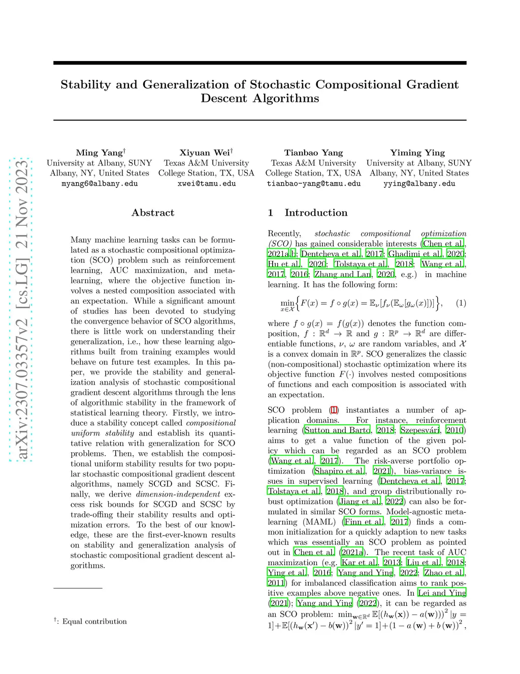 Many machine learning tasks can be formulated as a stochastic compositional optimization (SCO) problem such as reinforcement learning, AUC maximization, and meta-learning, where the objective function involves a nested composition associated with an expectation. While a significant amount of studies has been devoted to studying the convergence behavior of SCO algorithms, there is little work on understanding their generalization, i.e., how these learning algorithms built from training examples would behave on future test examples. In this paper, we provide the stability and generalization analysis of stochastic compositional gradient descent algorithms through the lens of algorithmic stability in the framework of statistical learning theory. Firstly, we introduce a stability concept called compositional uniform stability and establish its quantitative relation with generalization for SCO problems. Then, we establish the compositional uniform stability results for two popular stochastic compositional gradient descent algorithms, namely SCGD and SCSC. Finally, we derive dimension-independent excess risk bounds for SCGD and SCSC by trade-offing their stability results and optimization errors. To the best of our knowledge, these are the first-ever-known results on stability and generalization analysis of stochastic compositional gradient descent algorithms.