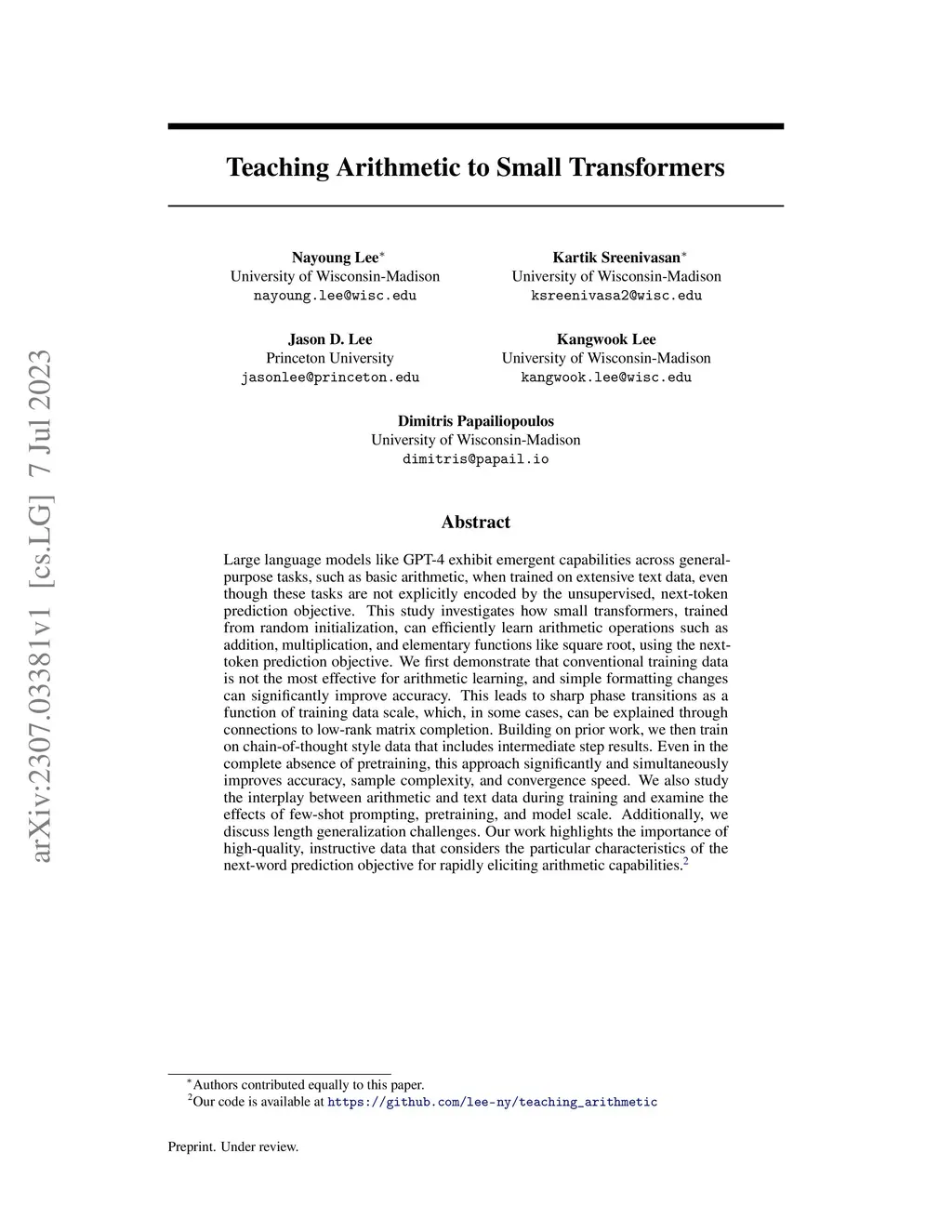 Large language models like GPT-4 exhibit emergent capabilities across general-purpose tasks, such as basic arithmetic, when trained on extensive text data, even though these tasks are not explicitly encoded by the unsupervised, next-token prediction objective. This study investigates how small transformers, trained from random initialization, can efficiently learn arithmetic operations such as addition, multiplication, and elementary functions like square root, using the next-token prediction objective. We first demonstrate that conventional training data is not the most effective for arithmetic learning, and simple formatting changes can significantly improve accuracy. This leads to sharp phase transitions as a function of training data scale, which, in some cases, can be explained through connections to low-rank matrix completion. Building on prior work, we then train on chain-of-thought style data that includes intermediate step results. Even in the complete absence of pretraining, this approach significantly and simultaneously improves accuracy, sample complexity, and convergence speed. We also study the interplay between arithmetic and text data during training and examine the effects of few-shot prompting, pretraining, and model scale. Additionally, we discuss length generalization challenges. Our work highlights the importance of high-quality, instructive data that considers the particular characteristics of the next-word prediction objective for rapidly eliciting arithmetic capabilities.
