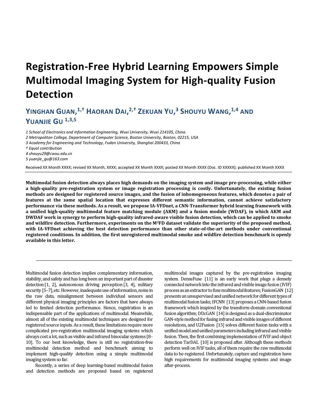 Multimodal fusion detection always places high demands on the imaging system and image pre-processing, while either a high-quality pre-registration system or image registration processing is costly. Unfortunately, the existing fusion methods are designed for registered source images, and the fusion of inhomogeneous features, which denotes a pair of features at the same spatial location that expresses different semantic information, cannot achieve satisfactory performance via these methods. As a result, we propose IA-VFDnet, a CNN-Transformer hybrid learning framework with a unified high-quality multimodal feature matching module (AKM) and a fusion module (WDAF), in which AKM and DWDAF work in synergy to perform high-quality infrared-aware visible fusion detection, which can be applied to smoke and wildfire detection. Furthermore, experiments on the M3FD dataset validate the superiority of the proposed method, with IA-VFDnet achieving the best detection performance than other state-of-the-art methods under conventional registered conditions. In addition, the first unregistered multimodal smoke and wildfire detection benchmark is openly available in this letter.