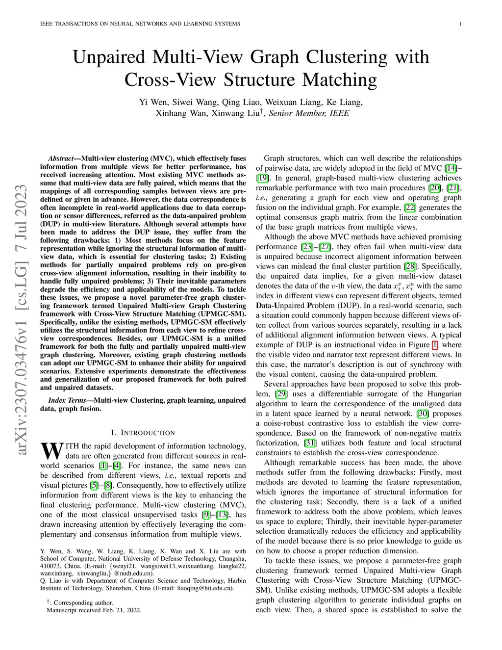 Multi-view clustering (MVC), which effectively fuses information from multiple views for better performance, has received increasing attention. Most existing MVC methods assume that multi-view data are fully paired, which means that the mappings of all corresponding samples between views are pre-defined or given in advance. However, the data correspondence is often incomplete in real-world applications due to data corruption or sensor differences, referred as the data-unpaired problem (DUP) in multi-view literature. Although several attempts have been made to address the DUP issue, they suffer from the following drawbacks: 1) Most methods focus on the feature representation while ignoring the structural information of multi-view data, which is essential for clustering tasks; 2) Existing methods for partially unpaired problems rely on pre-given cross-view alignment information, resulting in their inability to handle fully unpaired problems; 3) Their inevitable parameters degrade the efficiency and applicability of the models. To tackle these issues, we propose a novel parameter-free graph clustering framework termed Unpaired Multi-view Graph Clustering framework with Cross-View Structure Matching (UPMGC-SM). Specifically, unlike the existing methods, UPMGC-SM effectively utilizes the structural information from each view to refine cross-view correspondences. Besides, our UPMGC-SM is a unified framework for both the fully and partially unpaired multi-view graph clustering. Moreover, existing graph clustering methods can adopt our UPMGC-SM to enhance their ability for unpaired scenarios. Extensive experiments demonstrate the effectiveness and generalization of our proposed framework for both paired and unpaired datasets.