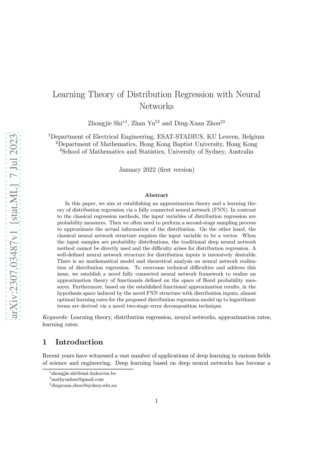 In this paper, we aim at establishing an approximation theory and a learning theory of distribution regression via a fully connected neural network (FNN). In contrast to the classical regression methods, the input variables of distribution regression are probability measures. Then we often need to perform a second-stage sampling process to approximate the actual information of the distribution. On the other hand, the classical neural network structure requires the input variable to be a vector. When the input samples are probability distributions, the traditional deep neural network method cannot be directly used and the difficulty arises for distribution regression. A well-defined neural network structure for distribution inputs is intensively desirable. There is no mathematical model and theoretical analysis on neural network realization of distribution regression. To overcome technical difficulties and address this issue, we establish a novel fully connected neural network framework to realize an approximation theory of functionals defined on the space of Borel probability measures. Furthermore, based on the established functional approximation results, in the hypothesis space induced by the novel FNN structure with distribution inputs, almost optimal learning rates for the proposed distribution regression model up to logarithmic terms are derived via a novel two-stage error decomposition technique.