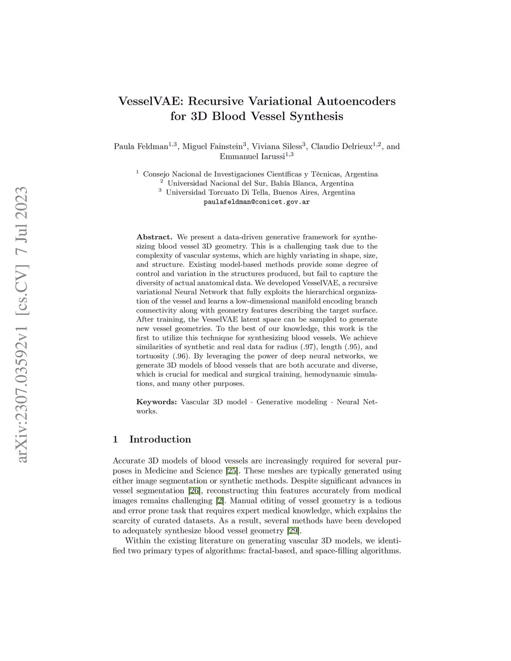 We present a data-driven generative framework for synthesizing blood vessel 3D geometry. This is a challenging task due to the complexity of vascular systems, which are highly variating in shape, size, and structure. Existing model-based methods provide some degree of control and variation in the structures produced, but fail to capture the diversity of actual anatomical data. We developed VesselVAE, a recursive variational Neural Network that fully exploits the hierarchical organization of the vessel and learns a low-dimensional manifold encoding branch connectivity along with geometry features describing the target surface. After training, the VesselVAE latent space can be sampled to generate new vessel geometries. To the best of our knowledge, this work is the first to utilize this technique for synthesizing blood vessels. We achieve similarities of synthetic and real data for radius (.97), length (.95), and tortuosity (.96). By leveraging the power of deep neural networks, we generate 3D models of blood vessels that are both accurate and diverse, which is crucial for medical and surgical training, hemodynamic simulations, and many other purposes.