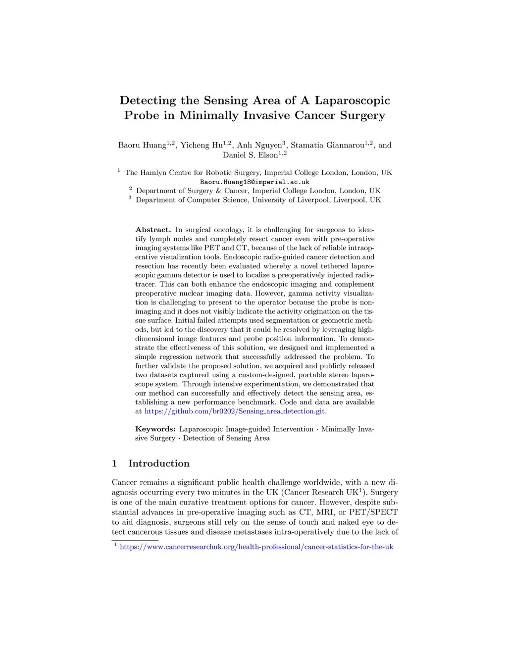In surgical oncology, it is challenging for surgeons to identify lymph nodes and completely resect cancer even with pre-operative imaging systems like PET and CT, because of the lack of reliable intraoperative visualization tools. Endoscopic radio-guided cancer detection and resection has recently been evaluated whereby a novel tethered laparoscopic gamma detector is used to localize a preoperatively injected radiotracer. This can both enhance the endoscopic imaging and complement preoperative nuclear imaging data. However, gamma activity visualization is challenging to present to the operator because the probe is non-imaging and it does not visibly indicate the activity origination on the tissue surface. Initial failed attempts used segmentation or geometric methods, but led to the discovery that it could be resolved by leveraging high-dimensional image features and probe position information. To demonstrate the effectiveness of this solution, we designed and implemented a simple regression network that successfully addressed the problem. To further validate the proposed solution, we acquired and publicly released two datasets captured using a custom-designed, portable stereo laparoscope system. Through intensive experimentation, we demonstrated that our method can successfully and effectively detect the sensing area, establishing a new performance benchmark. Code and data are available at https://github.com/br0202/Sensing_area_detection.git
