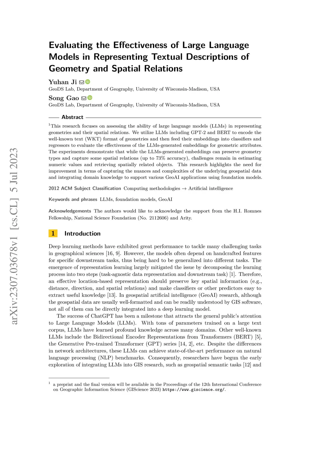 This research focuses on assessing the ability of large language models (LLMs) in representing geometries and their spatial relations. We utilize LLMs including GPT-2 and BERT to encode the well-known text (WKT) format of geometries and then feed their embeddings into classifiers and regressors to evaluate the effectiveness of the LLMs-generated embeddings for geometric attributes. The experiments demonstrate that while the LLMs-generated embeddings can preserve geometry types and capture some spatial relations (up to 73% accuracy), challenges remain in estimating numeric values and retrieving spatially related objects. This research highlights the need for improvement in terms of capturing the nuances and complexities of the underlying geospatial data and integrating domain knowledge to support various GeoAI applications using foundation models.