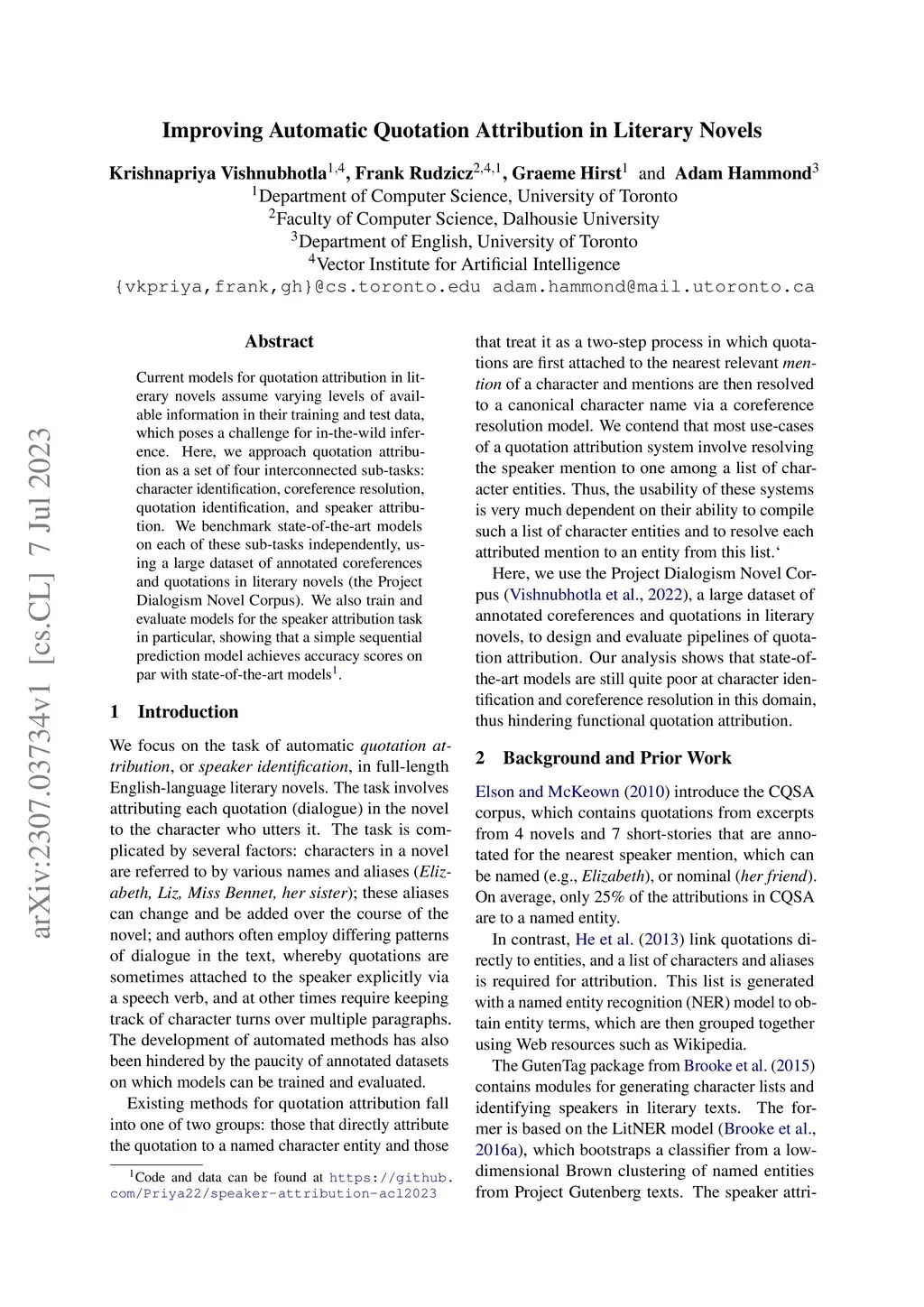 Current models for quotation attribution in literary novels assume varying levels of available information in their training and test data, which poses a challenge for in-the-wild inference. Here, we approach quotation attribution as a set of four interconnected sub-tasks: character identification, coreference resolution, quotation identification, and speaker attribution. We benchmark state-of-the-art models on each of these sub-tasks independently, using a large dataset of annotated coreferences and quotations in literary novels (the Project Dialogism Novel Corpus). We also train and evaluate models for the speaker attribution task in particular, showing that a simple sequential prediction model achieves accuracy scores on par with state-of-the-art models.