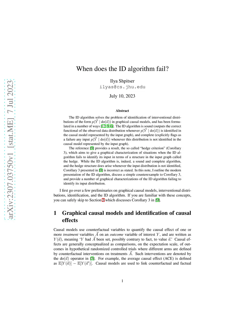 The ID algorithm solves the problem of identification of interventional distributions of the form p(Y | do(a)) in graphical causal models, and has been formulated in a number of ways [12, 9, 6]. The ID algorithm is sound (outputs the correct functional of the observed data distribution whenever p(Y | do(a)) is identified in the causal model represented by the input graph), and complete (explicitly flags as a failure any input p(Y | do(a)) whenever this distribution is not identified in the causal model represented by the input graph). The reference [9] provides a result, the so called "hedge criterion" (Corollary 3), which aims to give a graphical characterization of situations when the ID algorithm fails to identify its input in terms of a structure in the input graph called the hedge. While the ID algorithm is, indeed, a sound and complete algorithm, and the hedge structure does arise whenever the input distribution is not identified, Corollary 3 presented in [9] is incorrect as stated. In this note, I outline the modern presentation of the ID algorithm, discuss a simple counterexample to Corollary 3, and provide a number of graphical characterizations of the ID algorithm failing to identify its input distribution.