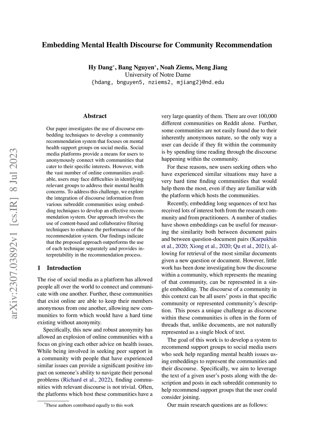 Our paper investigates the use of discourse embedding techniques to develop a community recommendation system that focuses on mental health support groups on social media. Social media platforms provide a means for users to anonymously connect with communities that cater to their specific interests. However, with the vast number of online communities available, users may face difficulties in identifying relevant groups to address their mental health concerns. To address this challenge, we explore the integration of discourse information from various subreddit communities using embedding techniques to develop an effective recommendation system. Our approach involves the use of content-based and collaborative filtering techniques to enhance the performance of the recommendation system. Our findings indicate that the proposed approach outperforms the use of each technique separately and provides interpretability in the recommendation process.